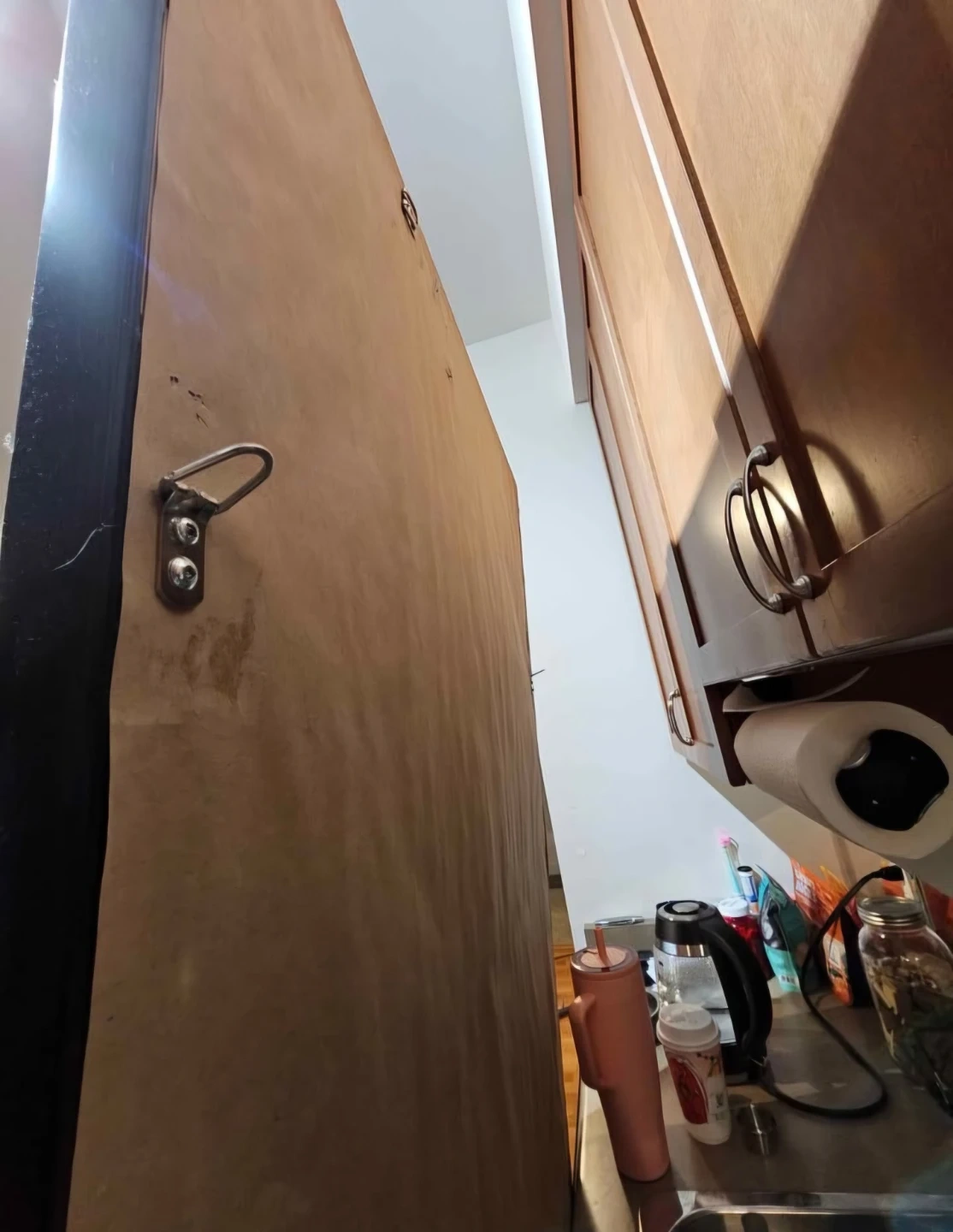 This is a large mirror with a dark wood frame. It has a hook on the back for hanging. The mirror is tall and wide, perfect for checking your outfit before heading out.