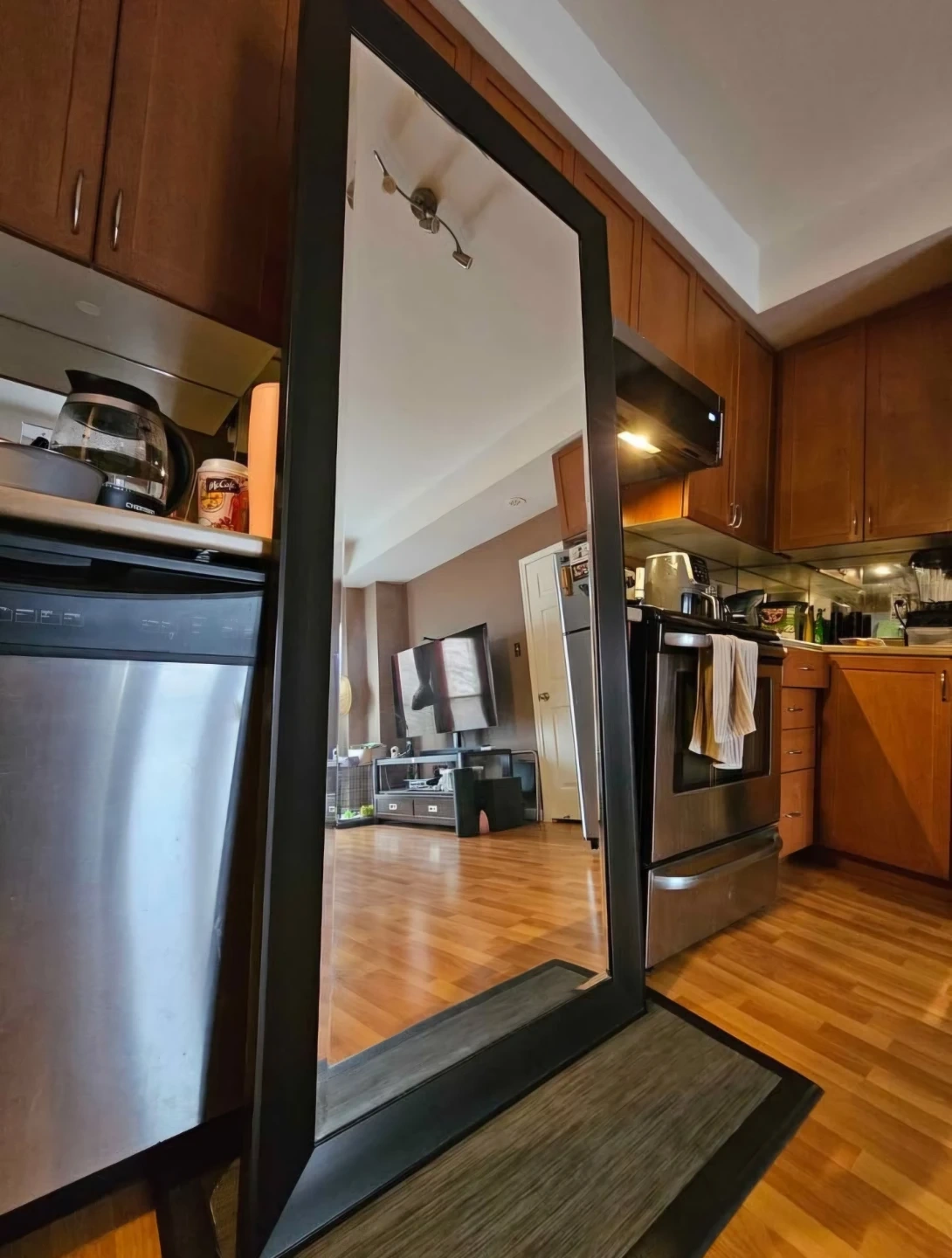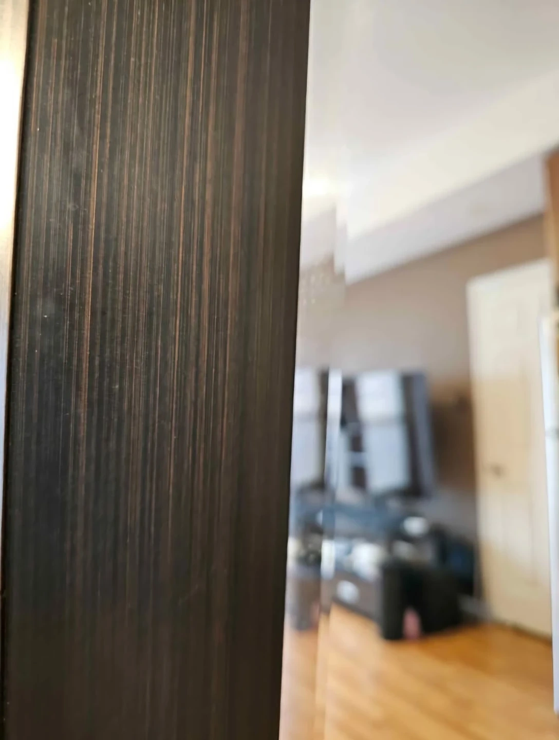 This is a large mirror with a dark wood frame. It has a hook on the back for hanging. The mirror is tall and wide, perfect for checking your outfit before heading out.