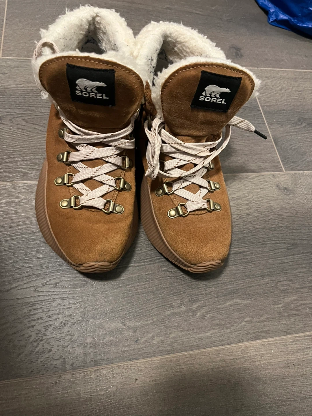 Cozy Sorel winter boots in a rich brown suede. These boots are lined with warm fleece for ultimate comfort. They feature a sturdy lug sole for great traction. Waterproof