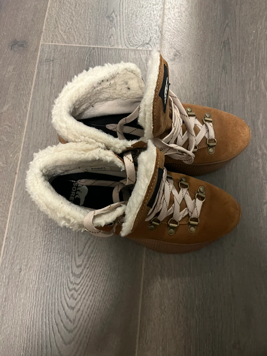 Cozy Sorel winter boots in a rich brown suede. These boots are lined with warm fleece for ultimate comfort. They feature a sturdy lug sole for great traction. Waterproof