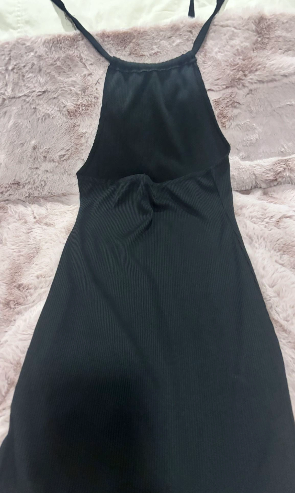 Simple, sexy, and effortlessly flattering. This black ribbed dress is a perfect minimalist staple with a subtle sultry edge. Size Small. Soft ribbed fabric. Half open back for a sexy, modern look. Lightweight & breathable. Body-skimming silhouette. Slips on easily. No label (brand unknown). Perfect for a night out, vacation, date night, or layering with a jacket or cardigan. Dress it up with heels or keep it casual with sandals. Excellent pre-owned condition.