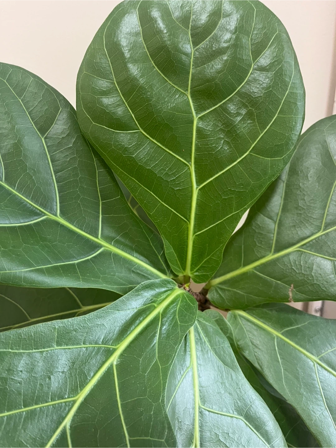 Healthy fiddle leaf fig plant in a stylish ceramic pot. The pot features a tri-color design with a ribbed texture at the base. This plant adds a touch of green to any indoor space. Perfect for bringing a bit of nature indoors!