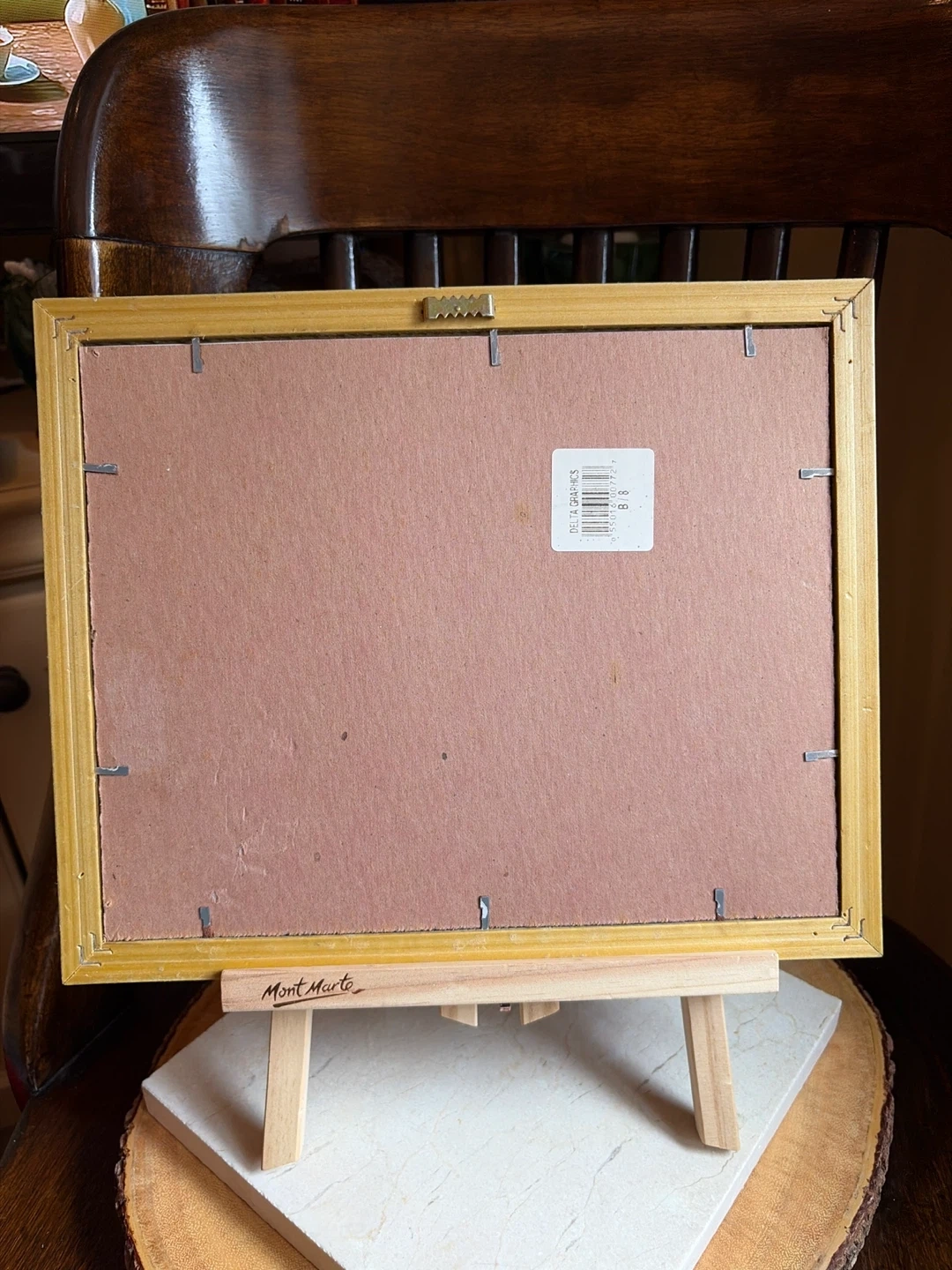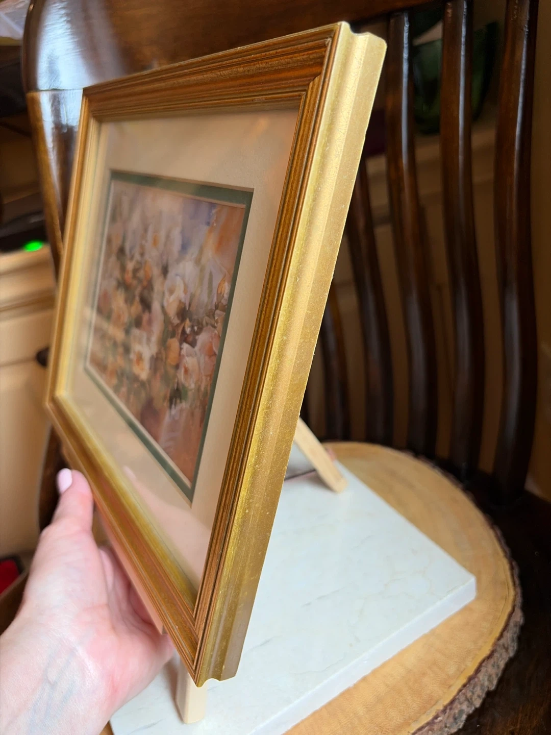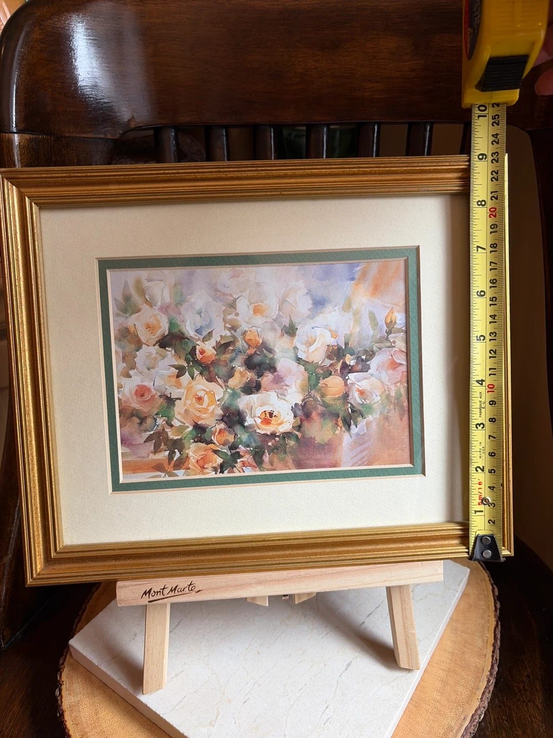 Watercolour print of a floral arrangement in a gold-toned frame. Features an ivory matting and a green accent border. The florals are light peach colour with green leaves. It is 11” wide and 9” tall. It has a sawtooth hanger in the back for easy hanging or could be displayed on an easel as I have. A really pretty floral piece!