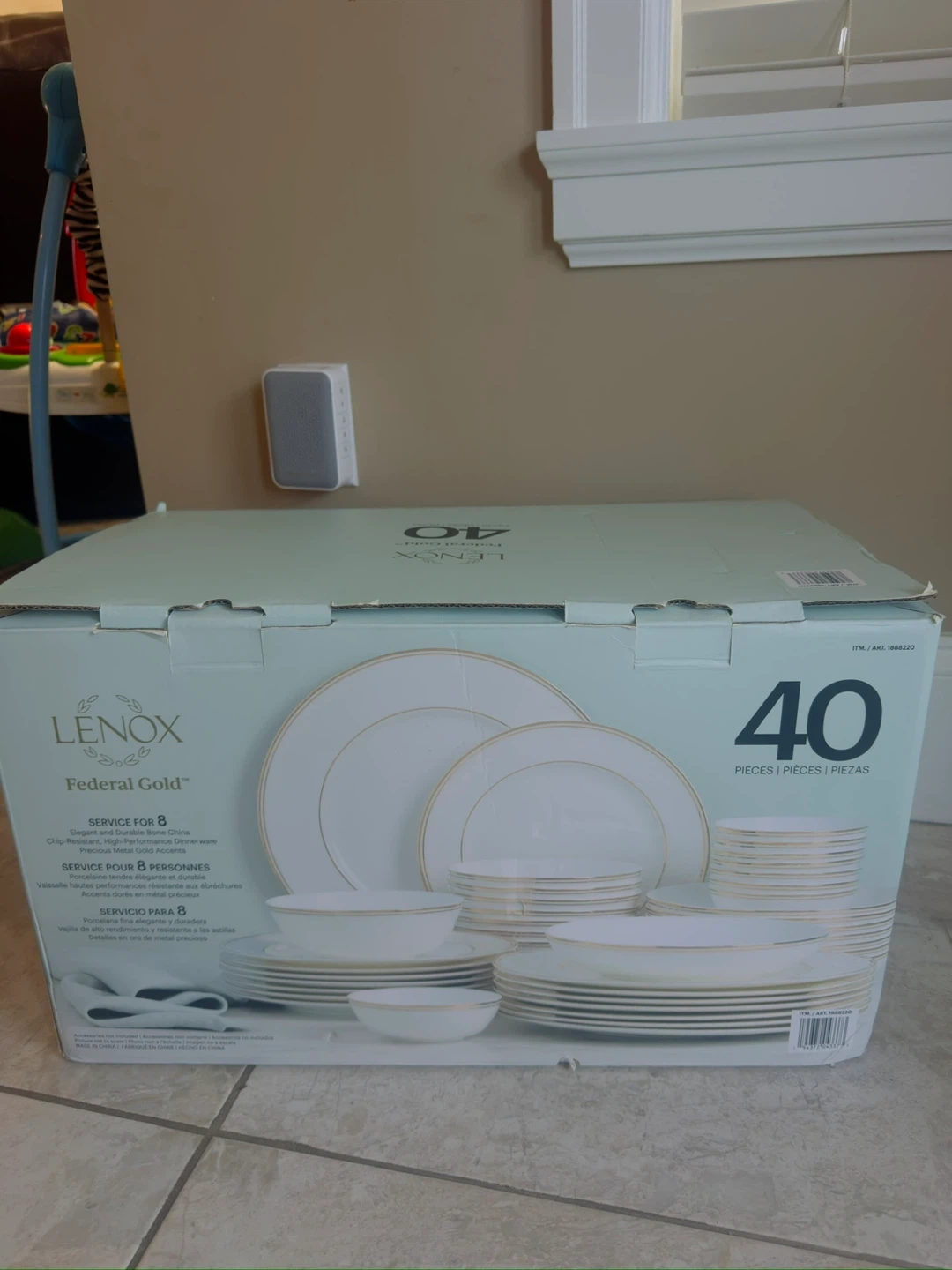 Selling a Lenox Federal Gold dinnerware set. This elegant set is perfect for special occasions or everyday use. It's a 40-piece set, service for 8, including dinner plates, salad plates, pasta bowls, cereal bowls, and fruit bowls. The set is made of elegant and durable bone china. Box included!
