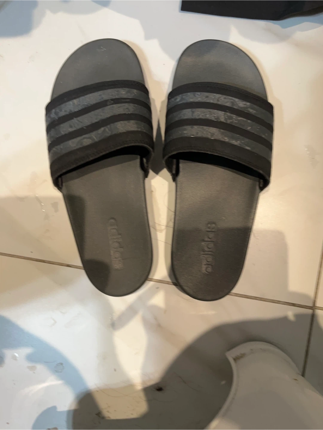 These are black Adidas Adilette Comfort slides. They're made of synthetic material with a comfortable contoured footbed. Great for casual wear or after sports!