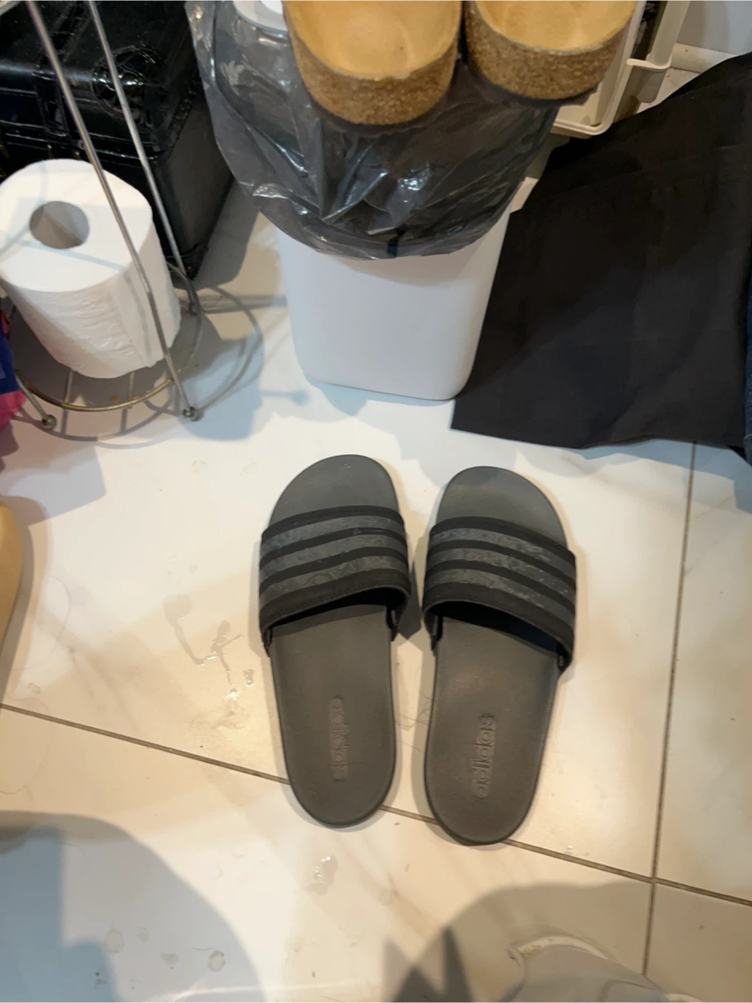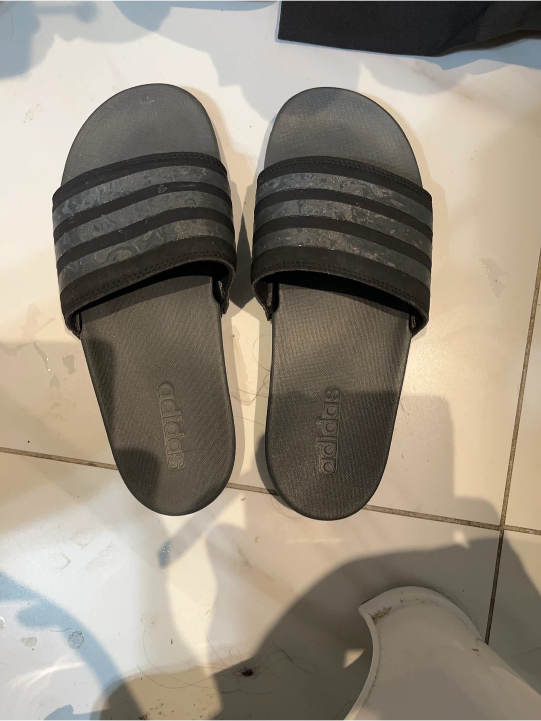 These are black Adidas Adilette Comfort slides. They're made of synthetic material with a comfortable contoured footbed. Great for casual wear or after sports!