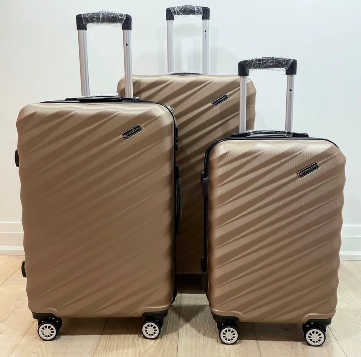 Set of three hard-shell suitcases (28/24/20) with combination locks. All have smooth rolling 360 degree wheels and retractable handles.