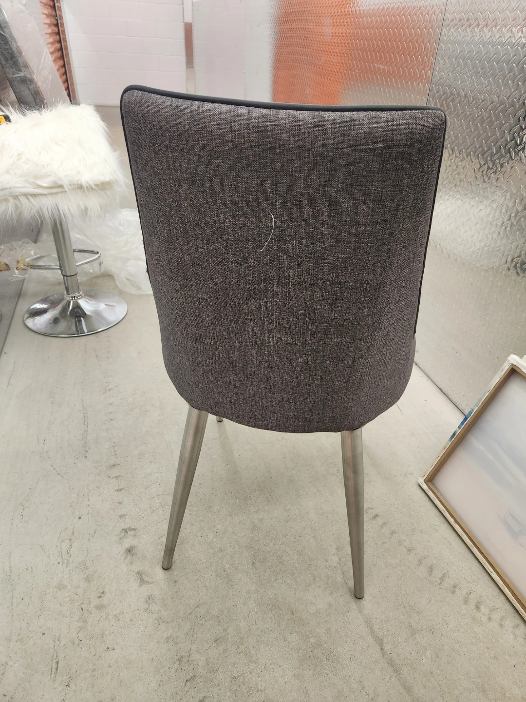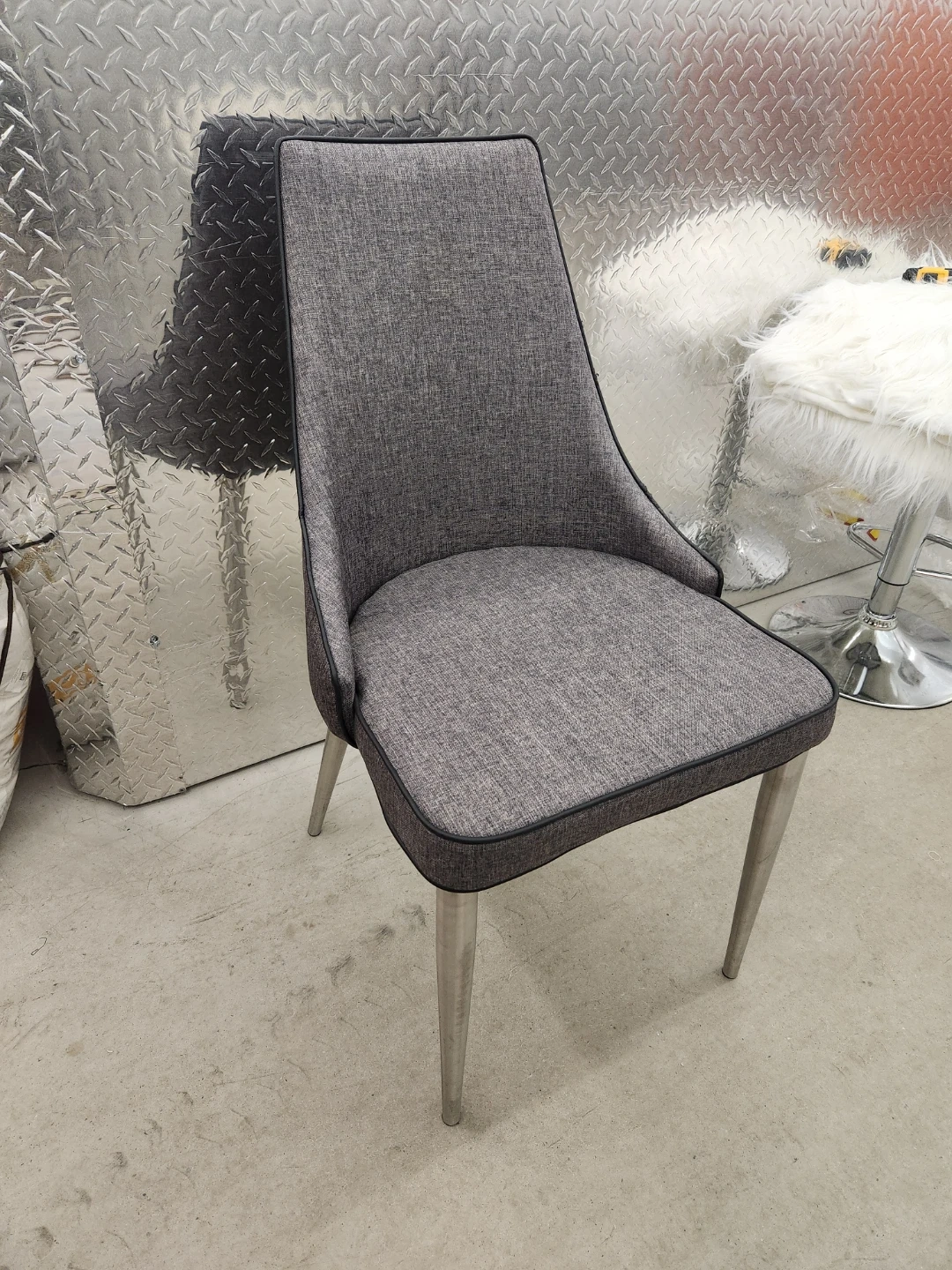 This dining chair features a dark grey textured fabric upholstery with contrasting piping. Its slim metal legs offer a modern touch. It's a comfortable chair for everyday use.