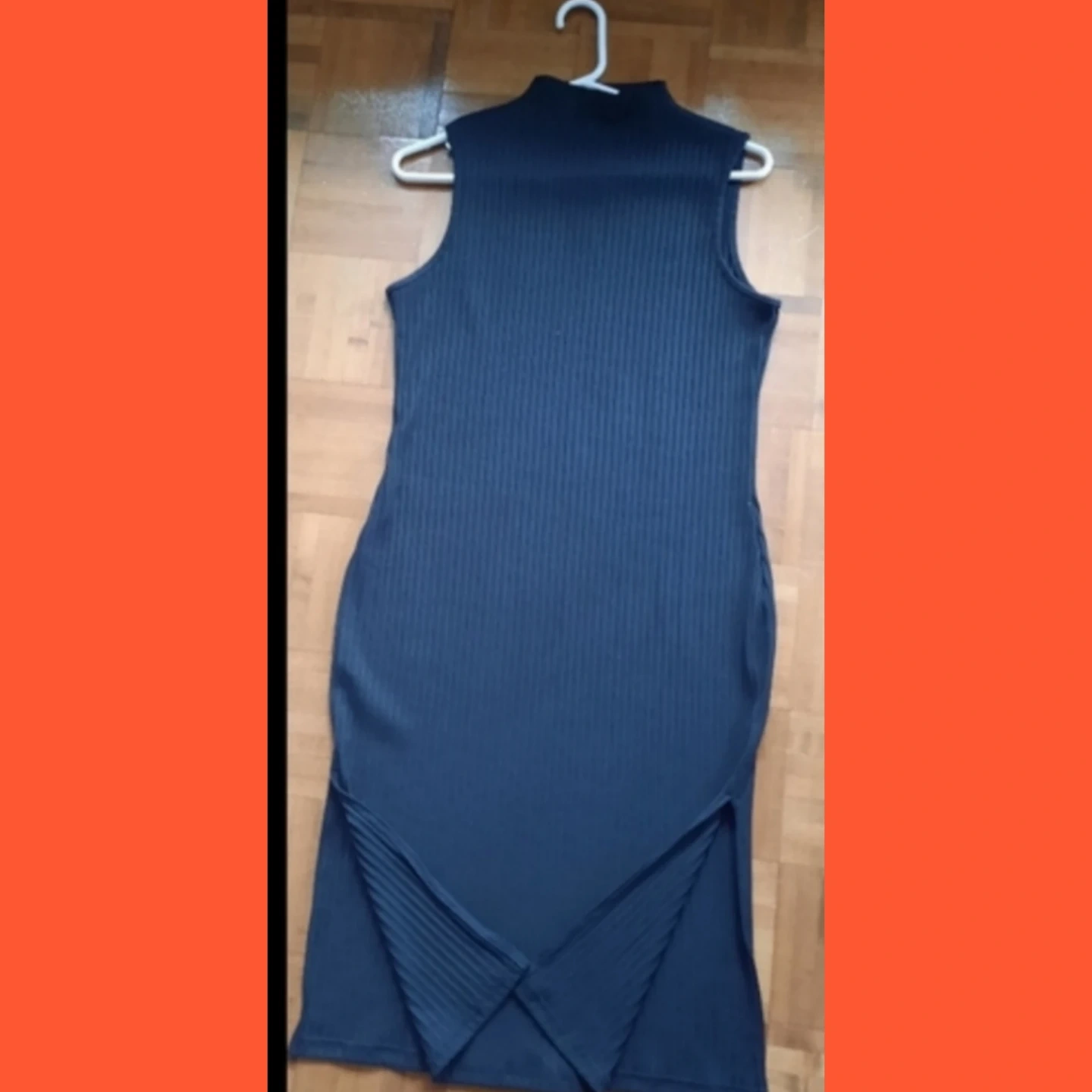 This black sleeveless dress features a mock neck and a ribbed knit material. It has a flattering silhouette with a split hem for added style. It's perfect for dressing up or down!