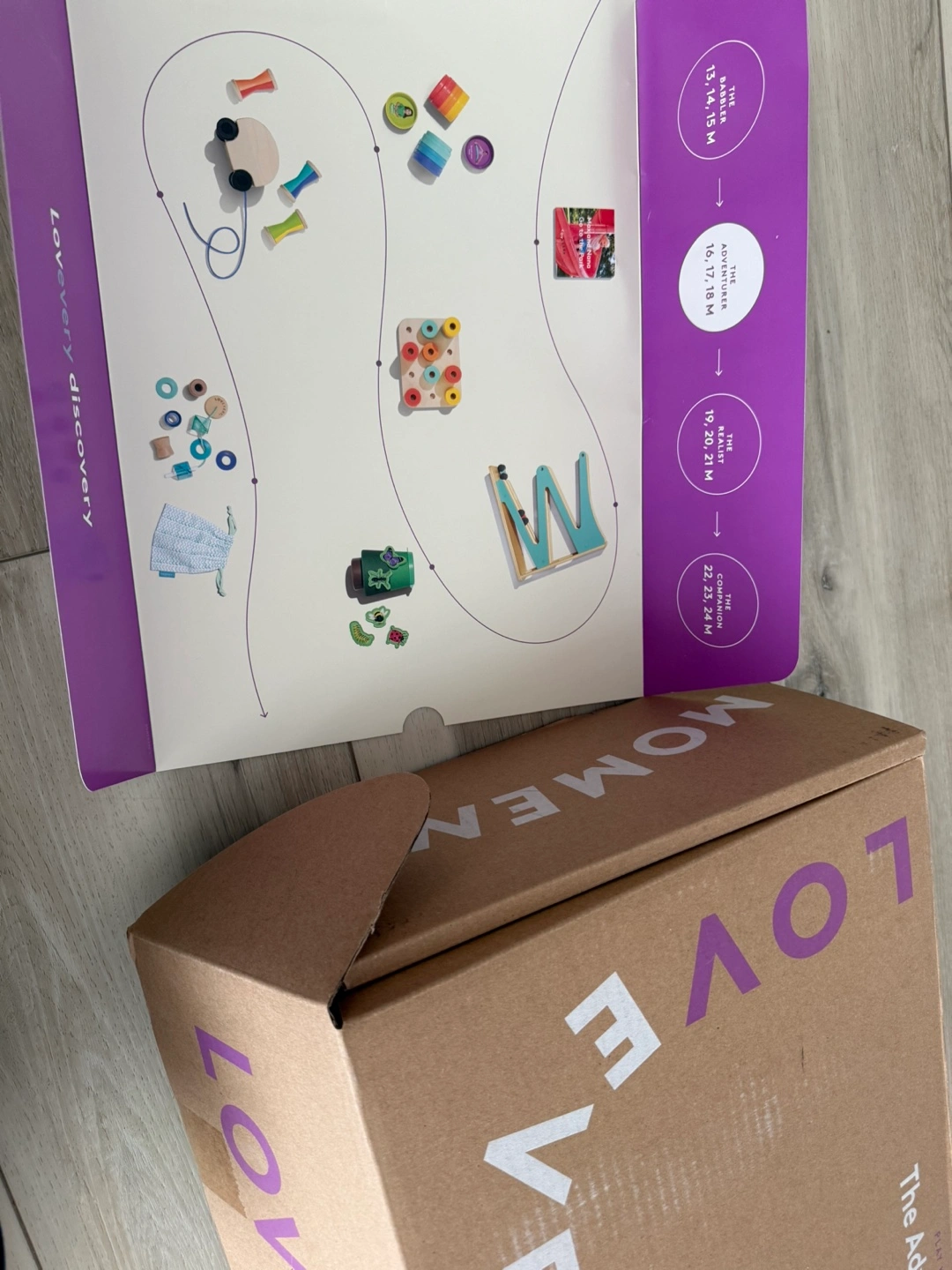 A set of Lovevery toys and accessories. Includes a wooden track and other learning objects. The kit promotes learning and a great opportunity for baby to learn and play. **(Stack cups and book not included)**( one of the race cars is not in good condition but its working please see the photos)**