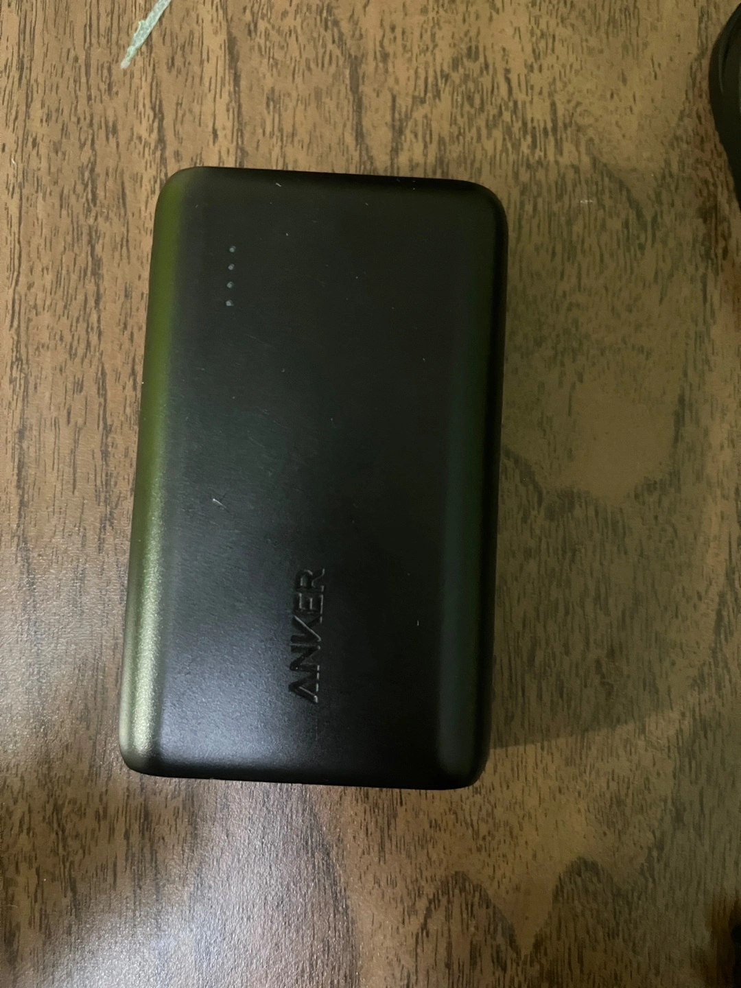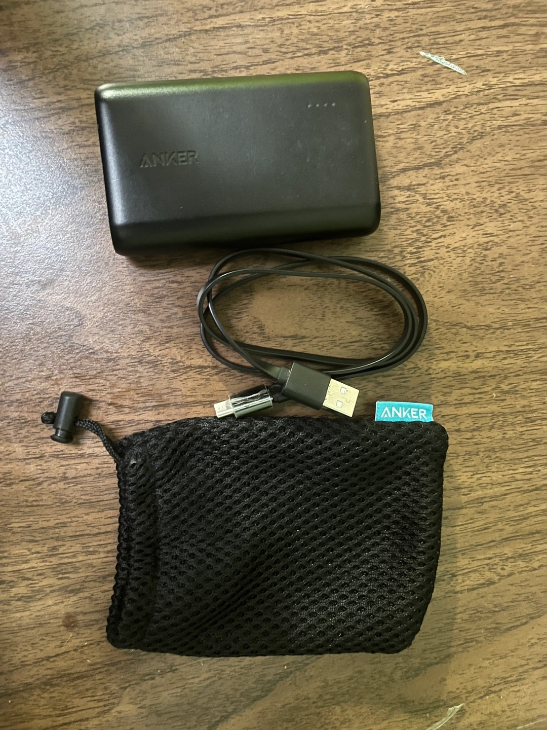 Anker portable charger, includes cable and carrying case. Compact and convenient for on-the-go charging.