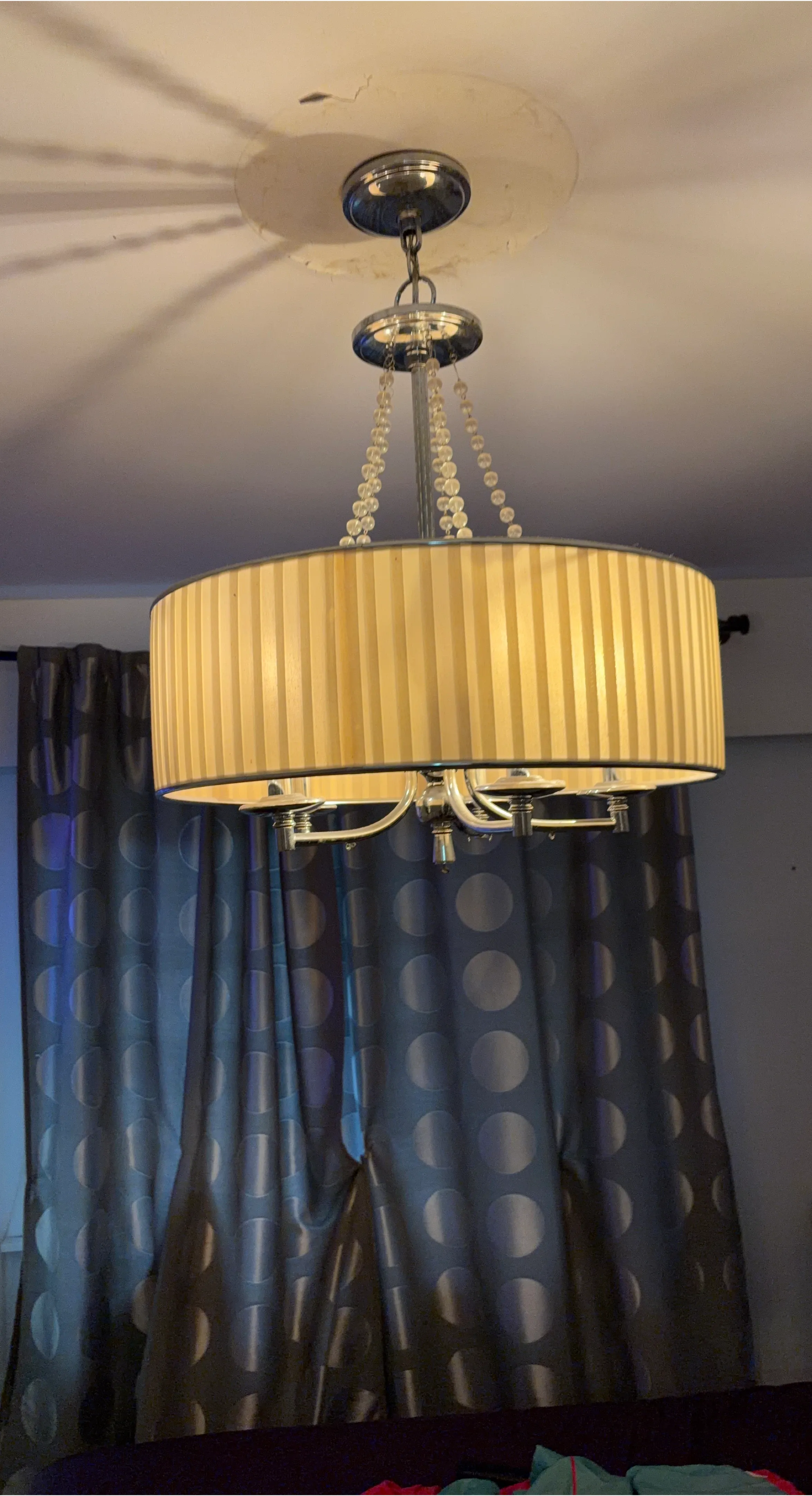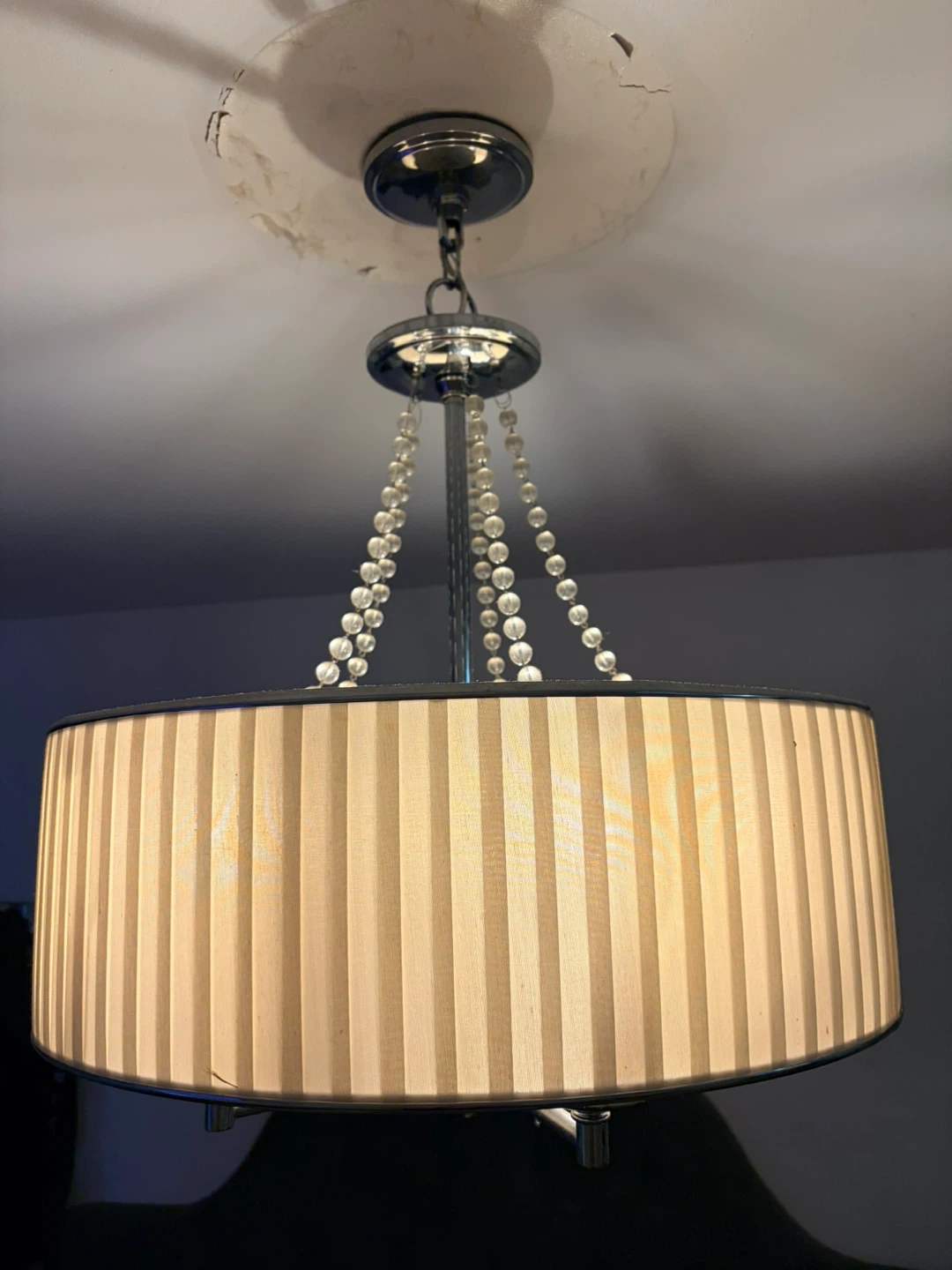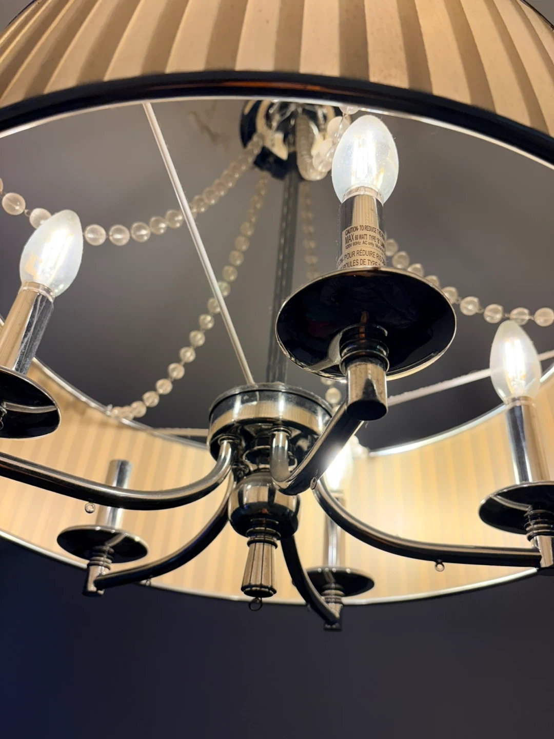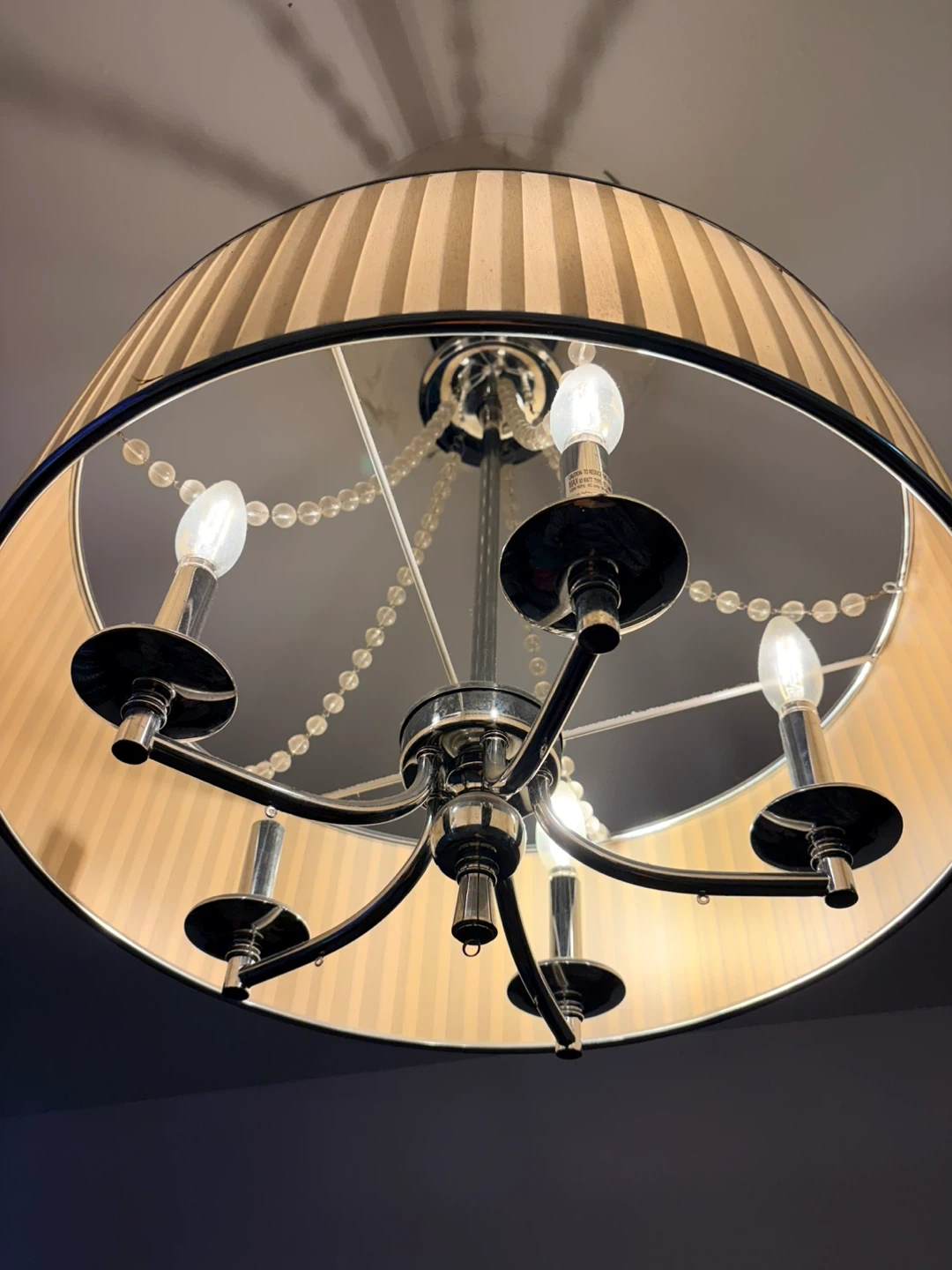 This elegant chandelier features a cream-coloured drum shade with vertical pleating and decorative beaded strands. It has a brushed nickel finish and accommodates four bulbs. Perfect for adding a touch of style to a room.