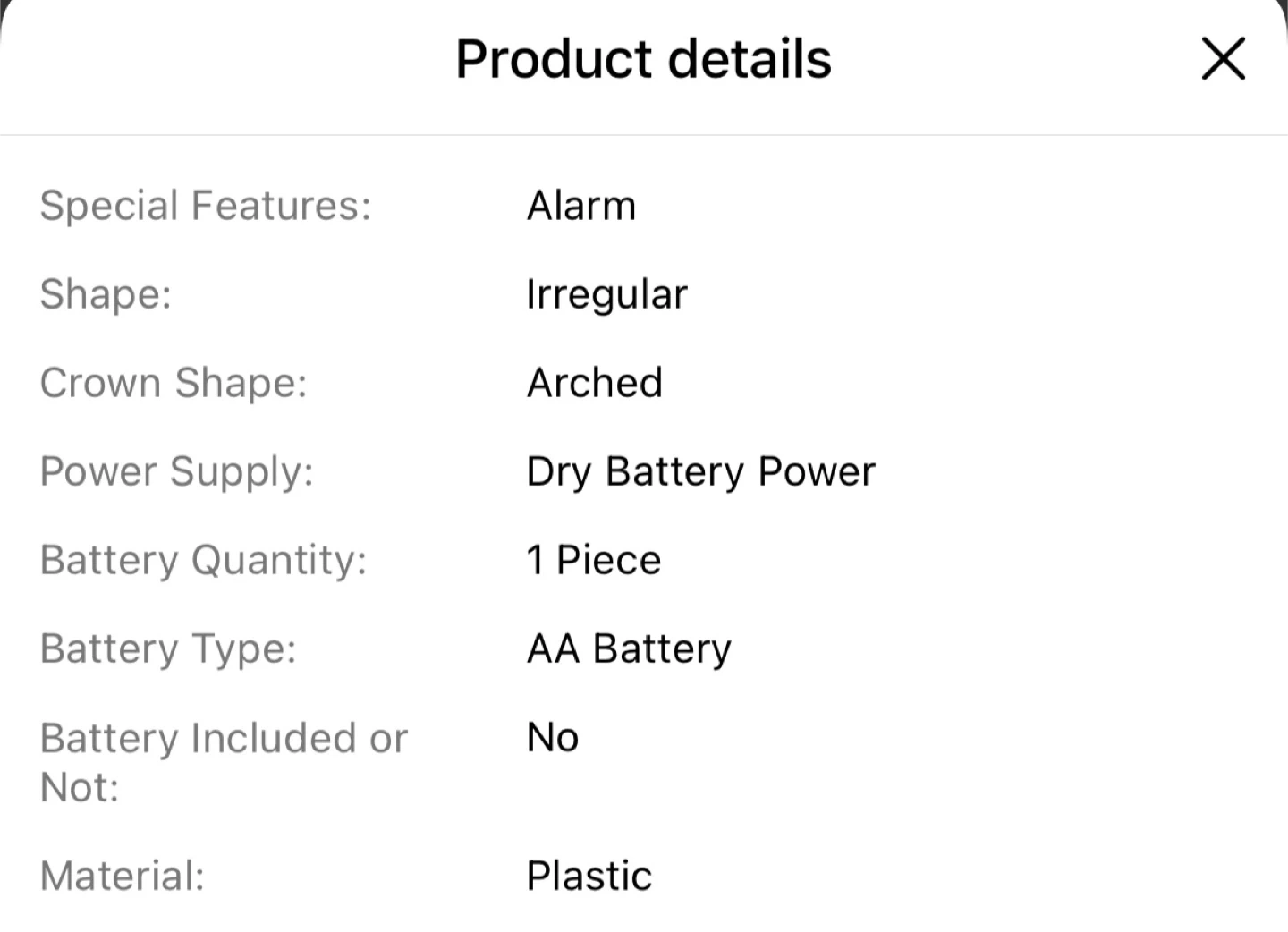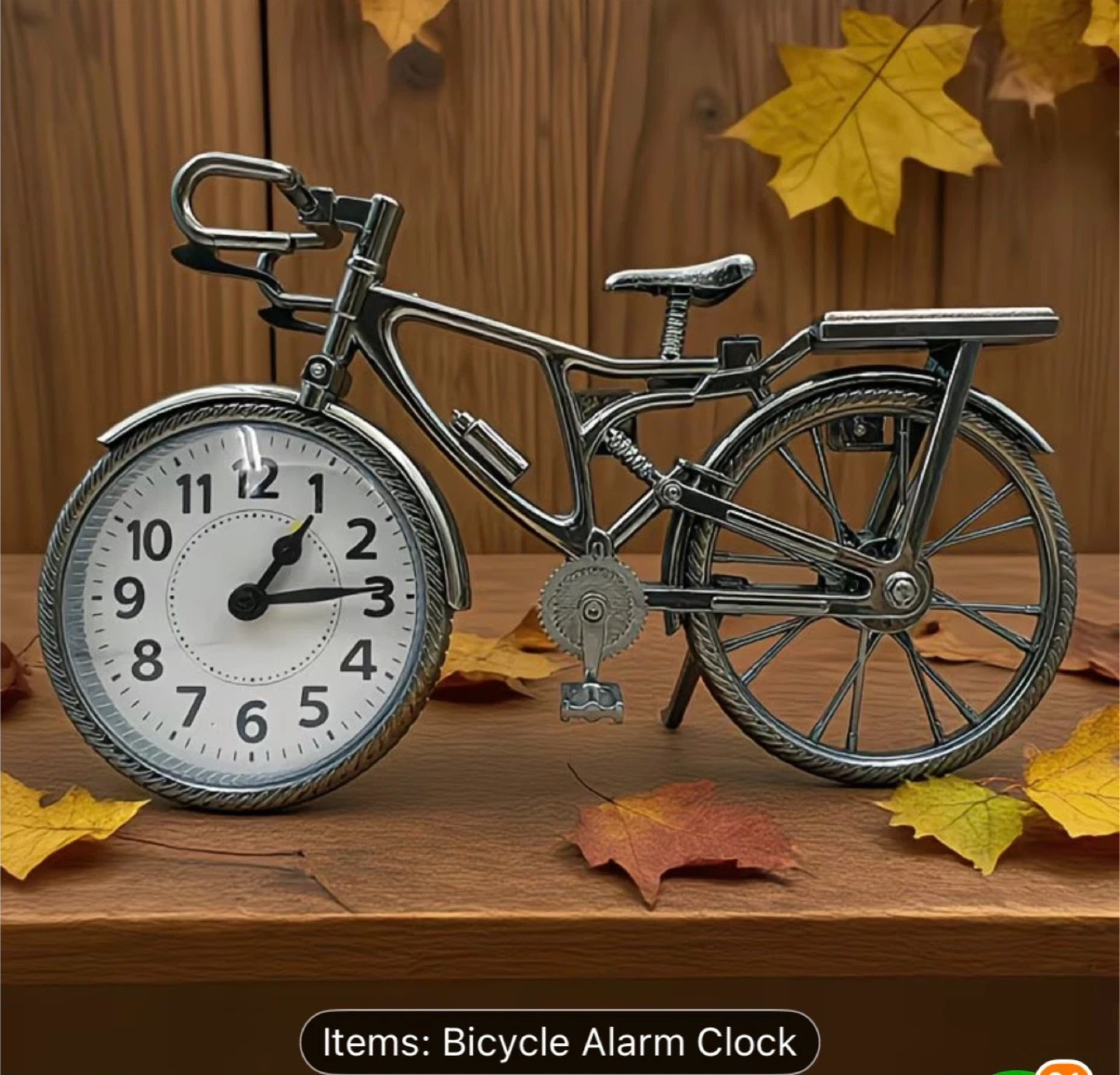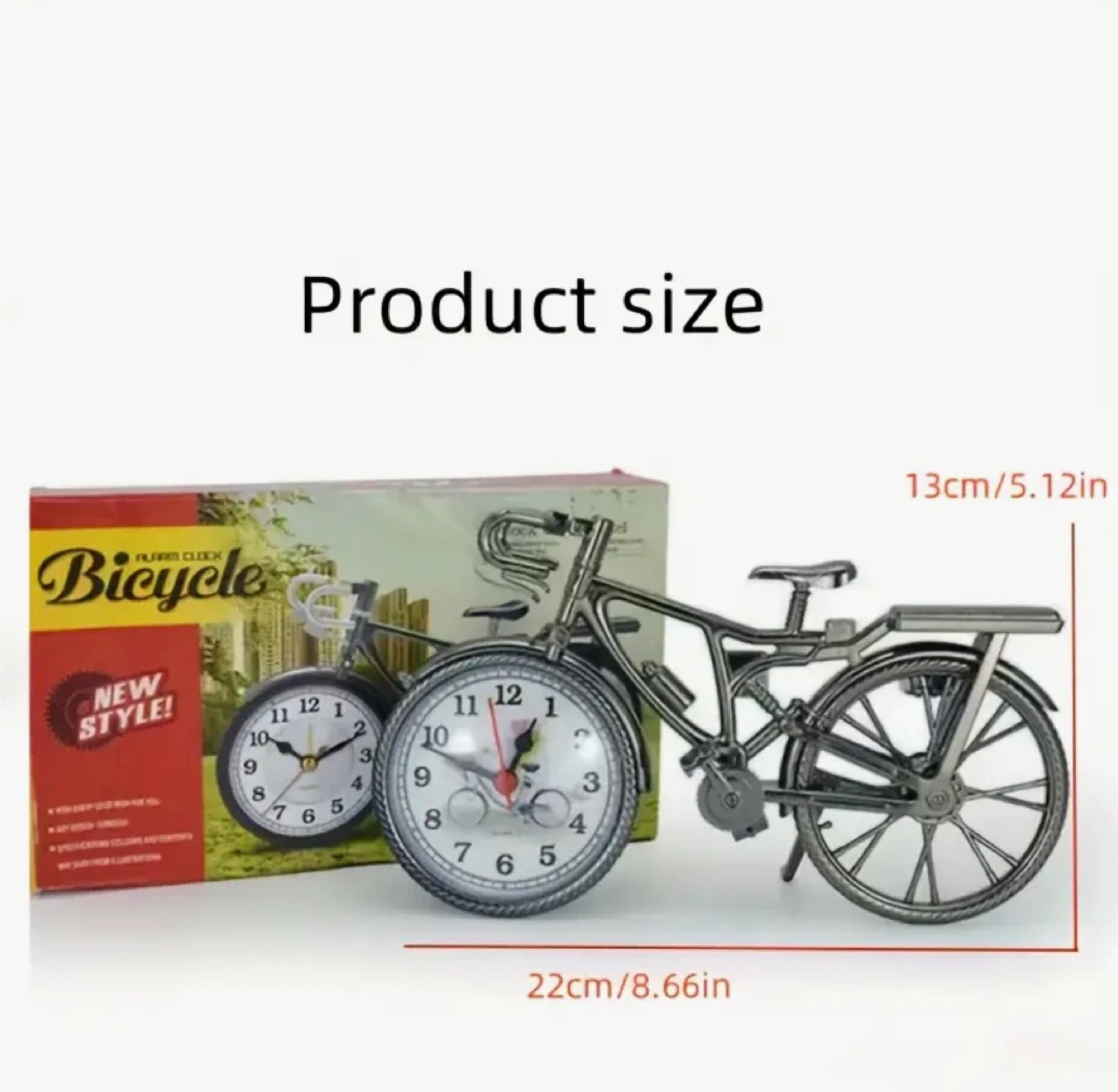 This is a bicycle alarm clock with an alarm feature. It's made of plastic and requires one AA battery, which isn't included. The clock measures 22cm x 13cm.