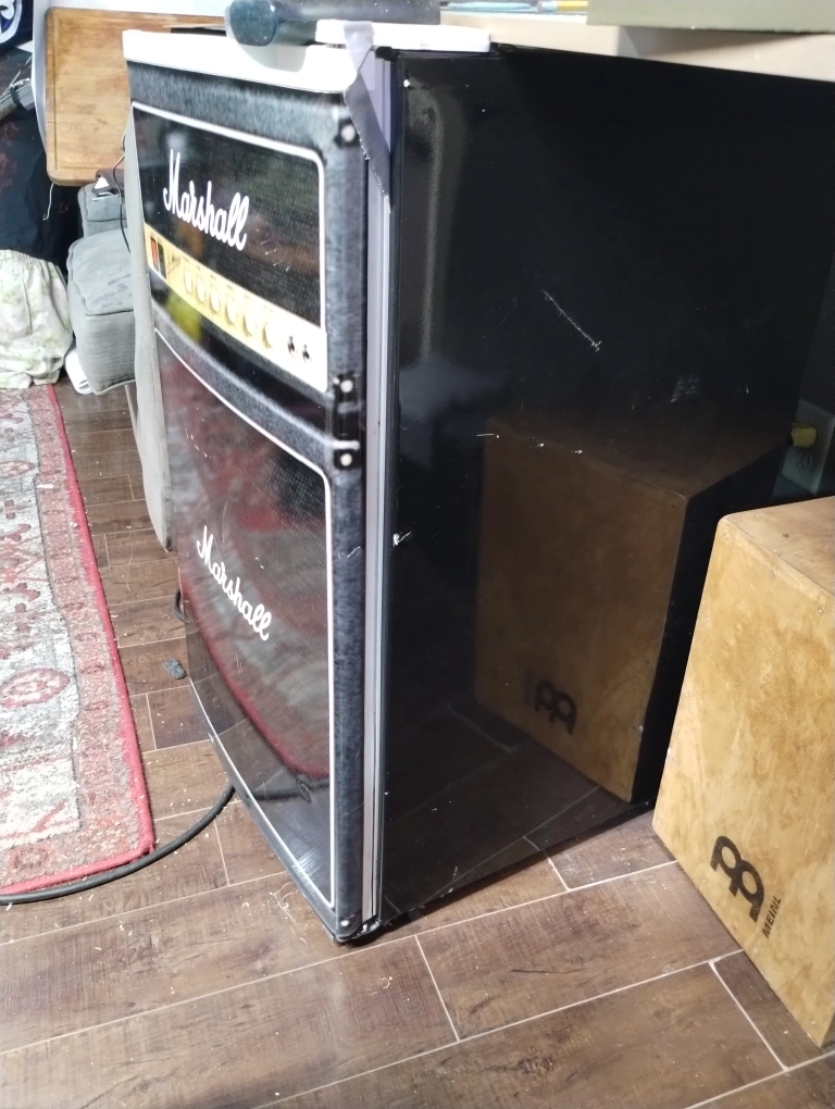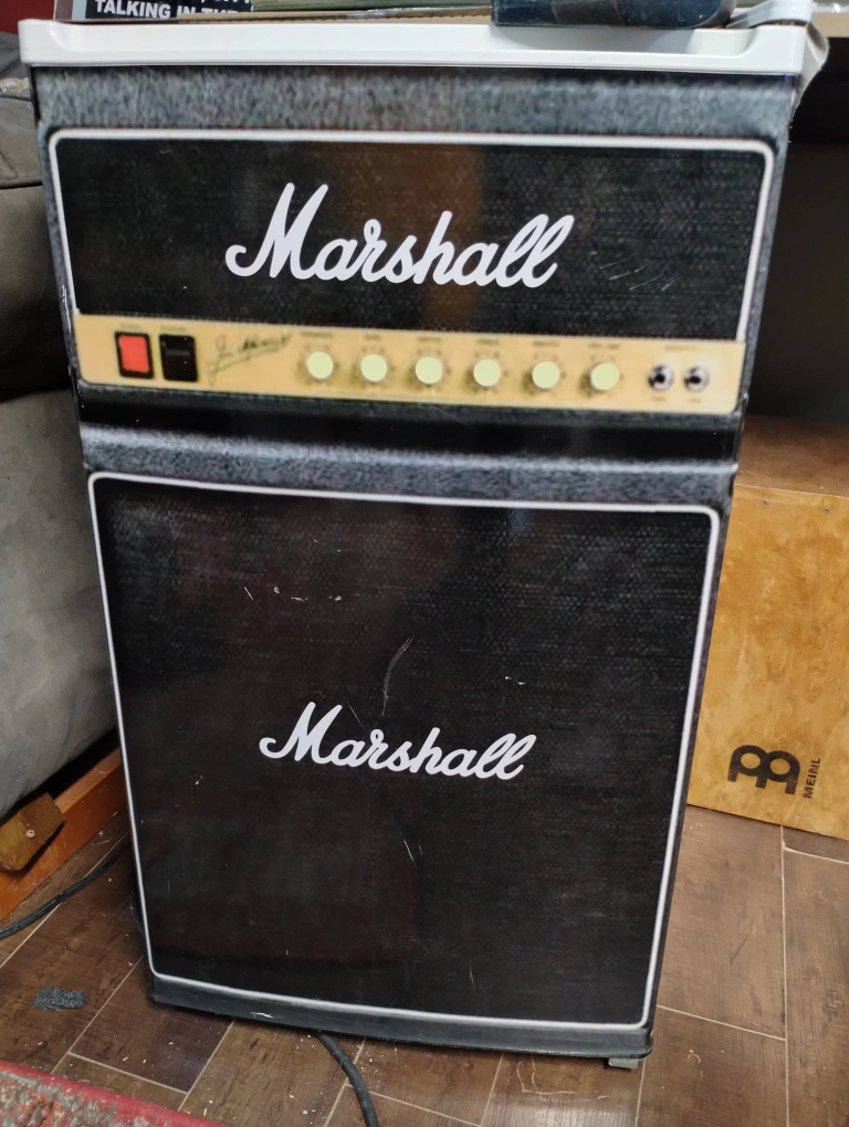 Small mini fridge with Marshall amp design. Has shelves and a freezer compartment. legs adjust to level it. works great looks great in my studio just don't use it and need the space.