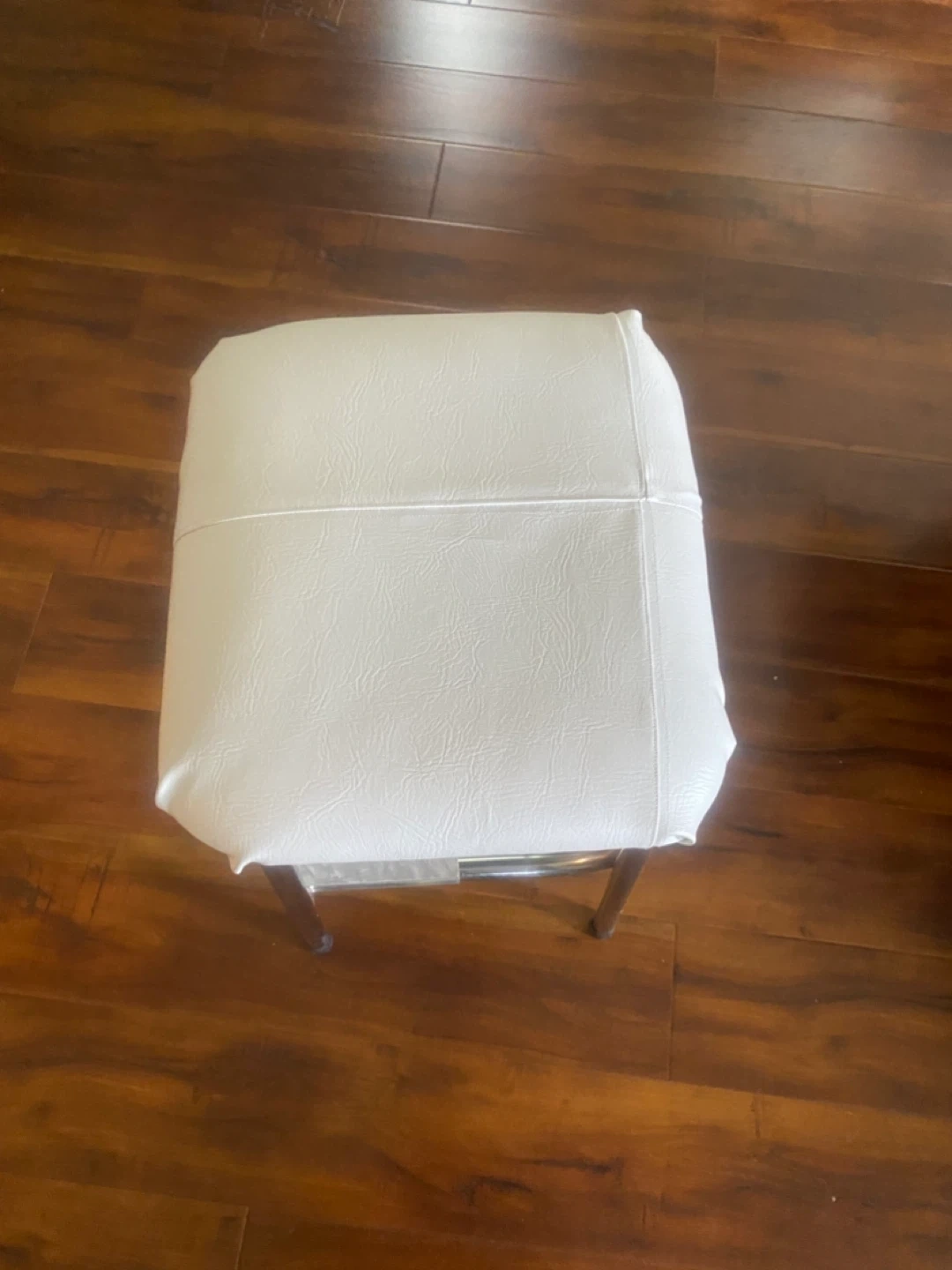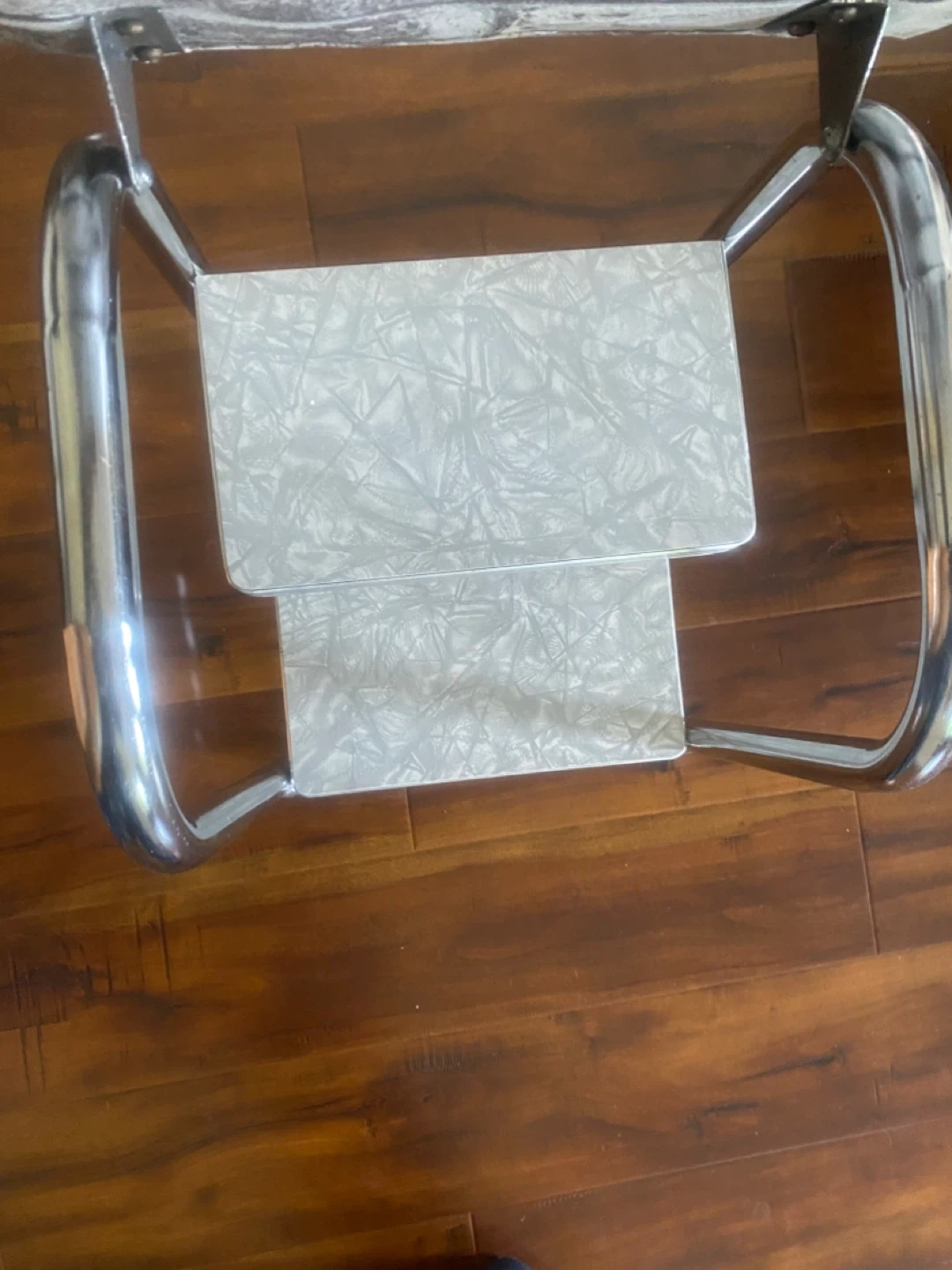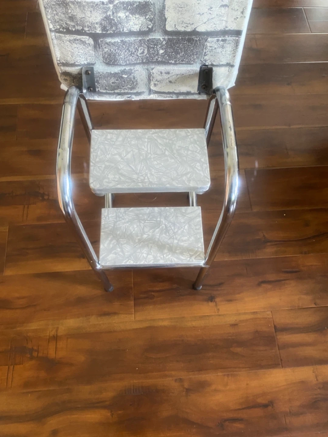 Selling a vintage chrome step stool! It has a white vinyl seat and two steps with a cool patterned design. Perfect for adding a retro touch to your home! Pick up Port Elmsley