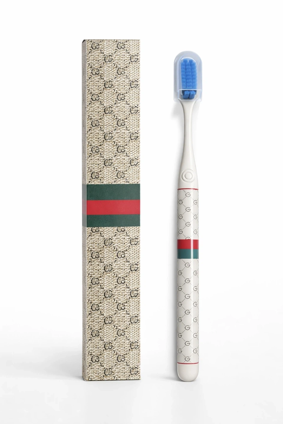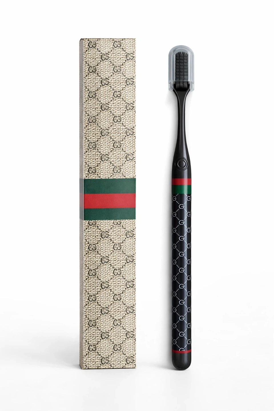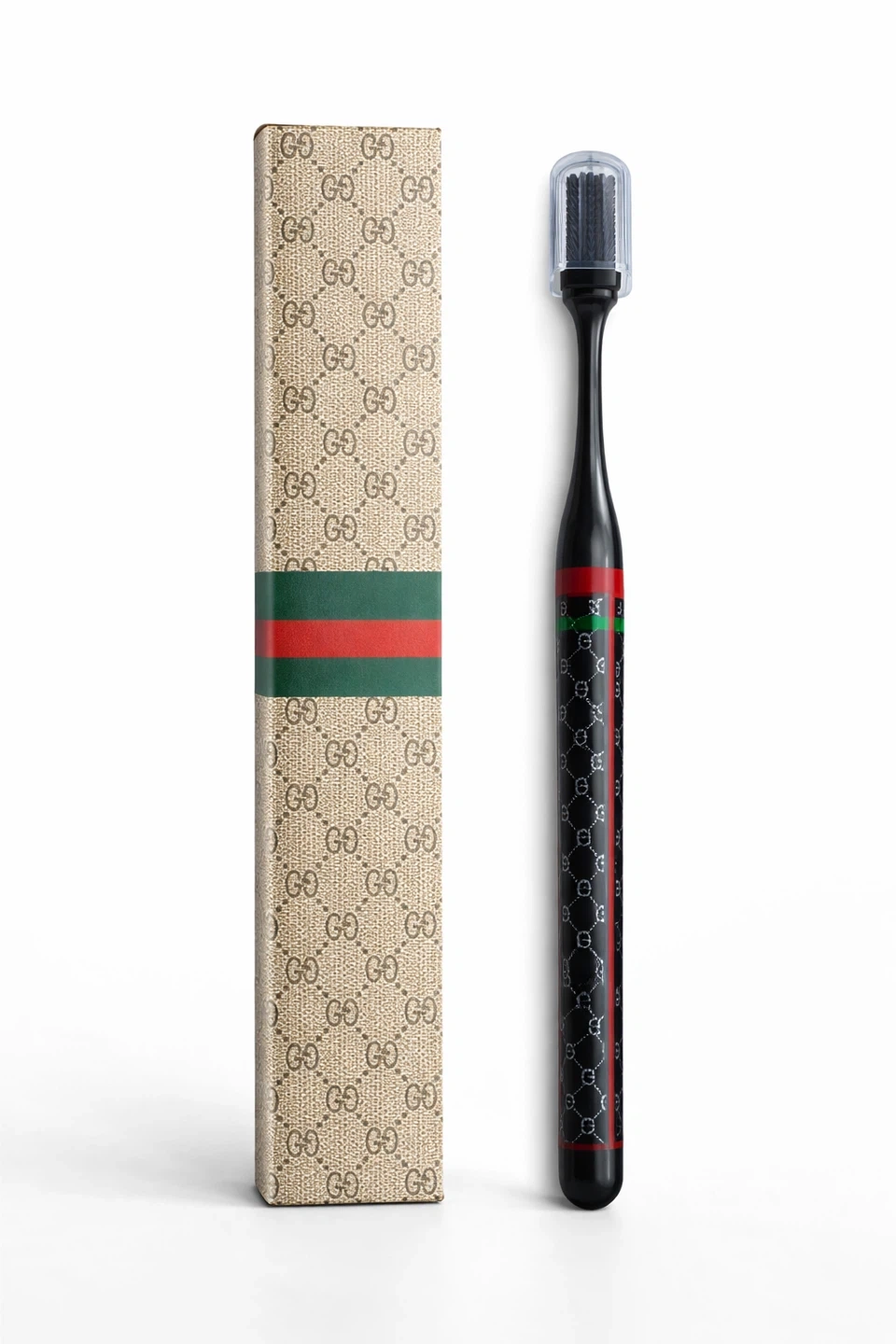 Stylish Gucci toothbrush. Features the iconic GG pattern and signature green and red stripe. Comes with protective cap and original box. Available in white, black, or brown.