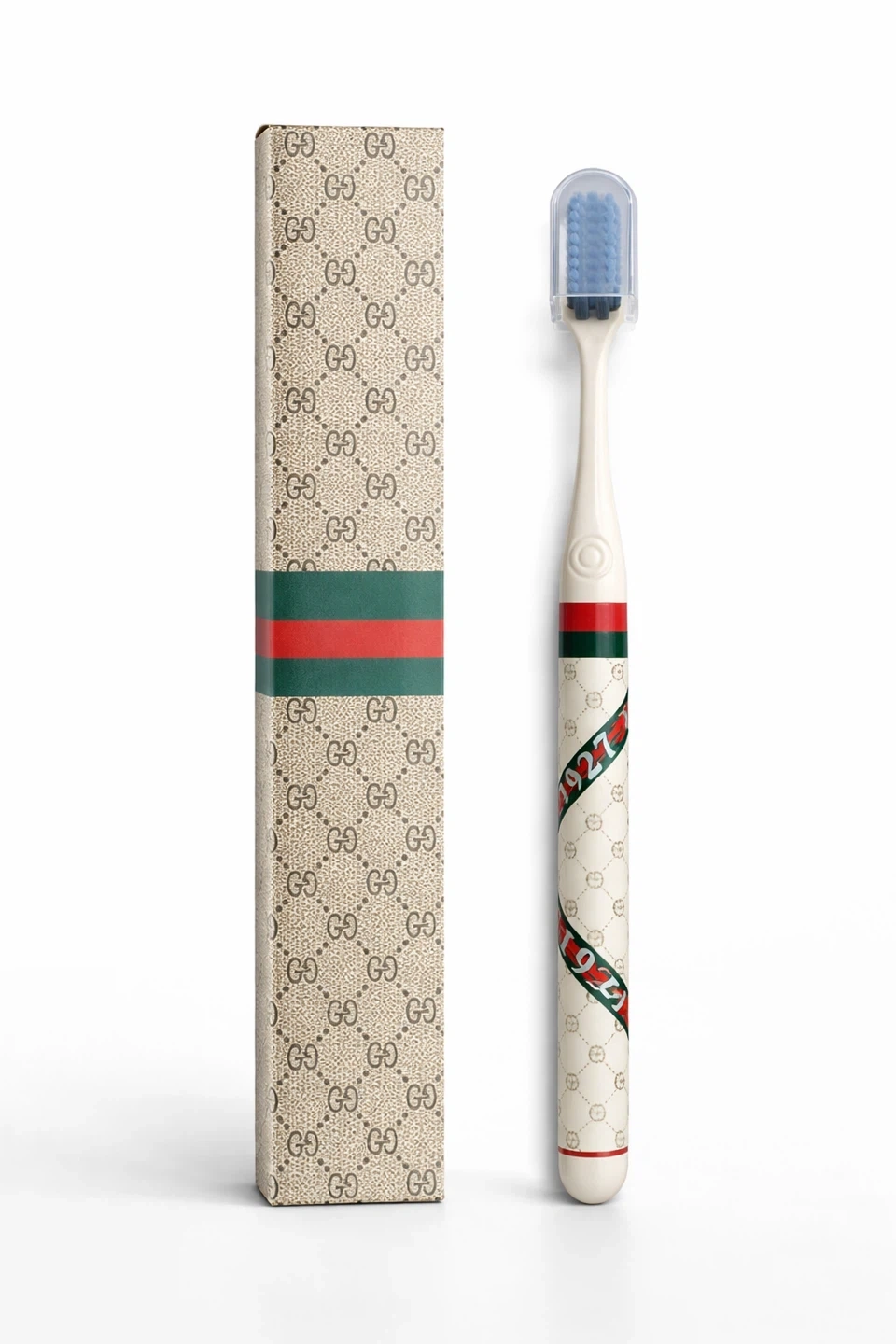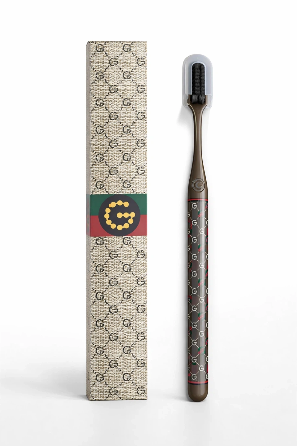 Stylish Gucci toothbrush. Features the iconic GG pattern and signature green and red stripe. Comes with protective cap and original box. Available in white, black, or brown.