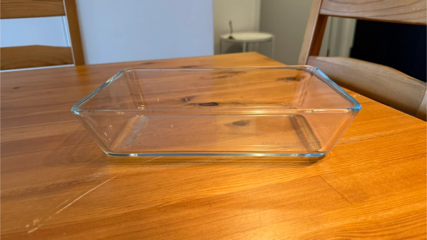 A clear glass Pyrex baking dish. It's made of durable glass and measures approximately 9x13 inches. This dish is oven-safe and suitable for baking or serving. It's great for casseroles and roasts!