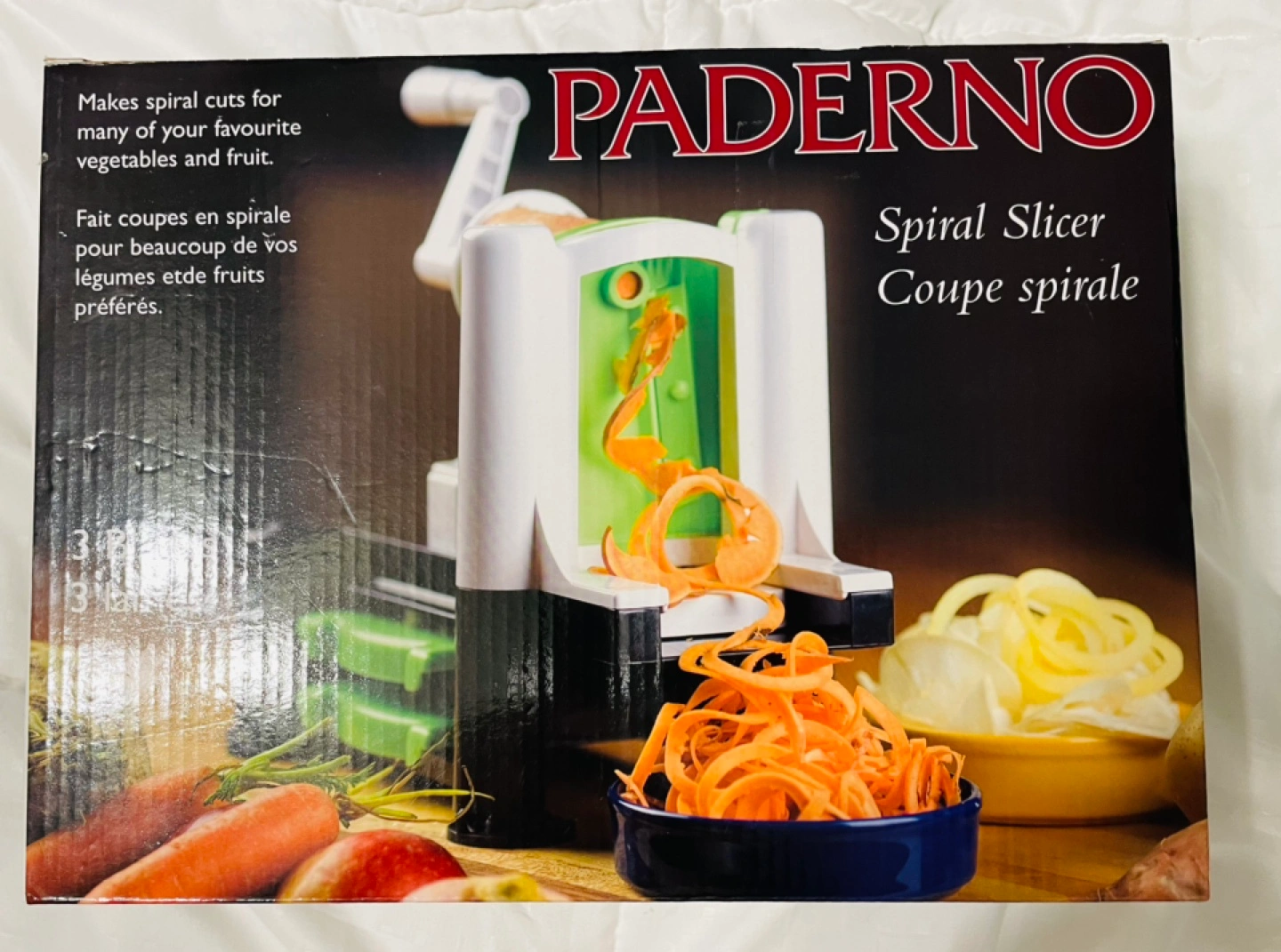 New Paderno spiralizer slicer. Three interchangeable stainless steel blades. No-slip suction bottom. Makes spiral cuts for vegetables and fruit. Instructions included.