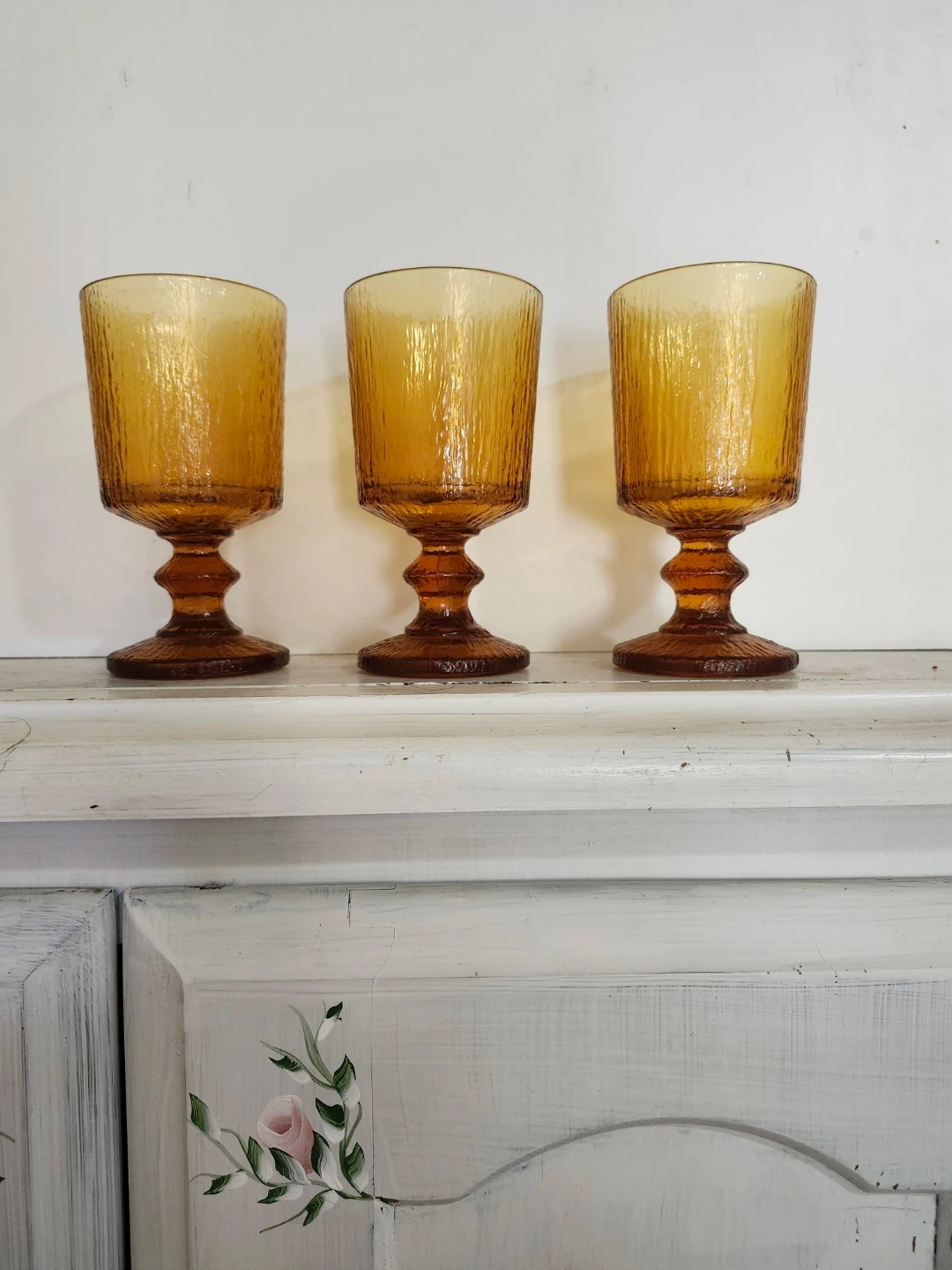 This is a set of three amber coloured glass goblets. They feature a textured design on the bowl and a detailed stem. Perfect for serving beverages or as decorative pieces!