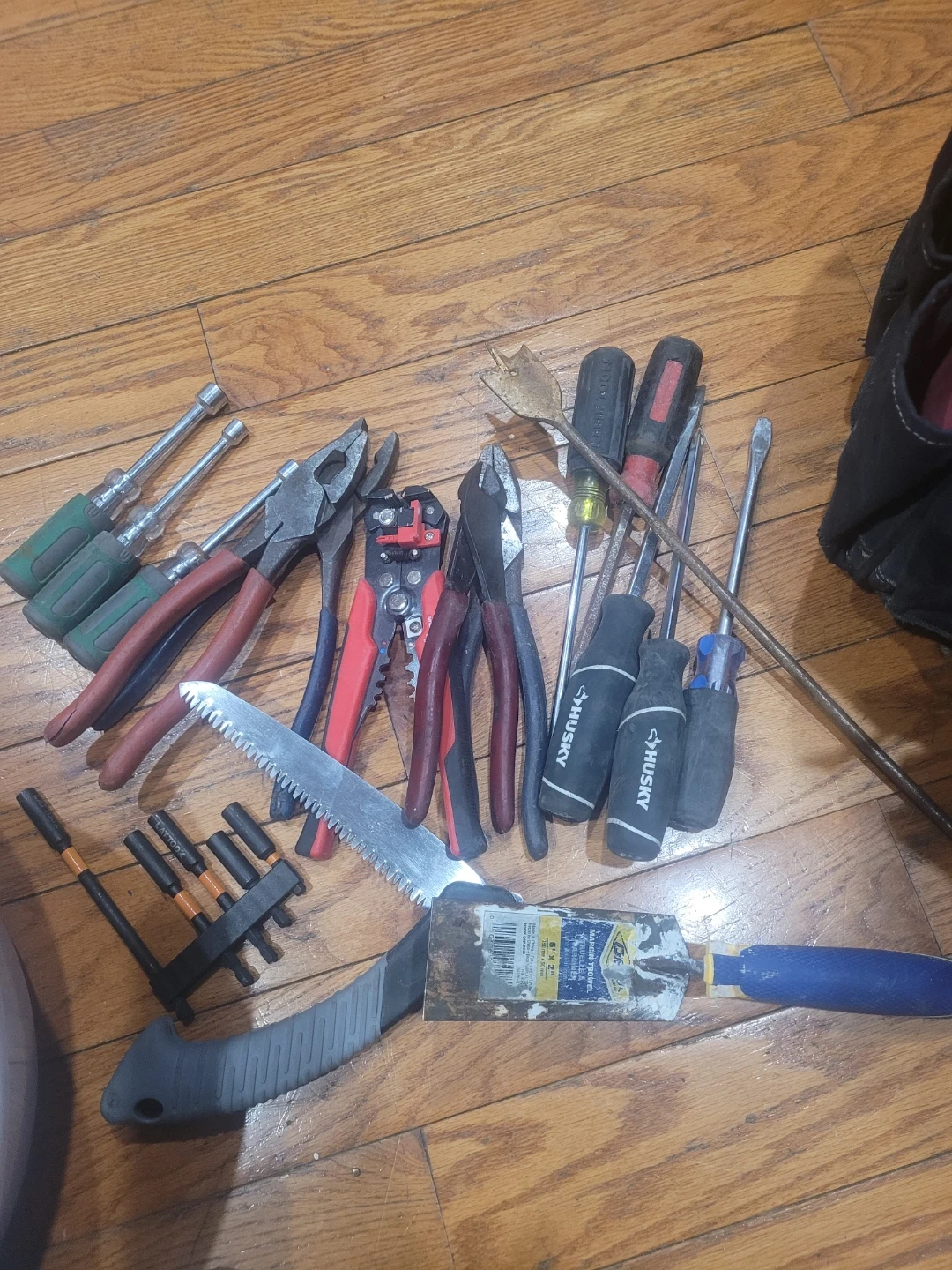 This red and black Husky rolling tool bag comes with a variety of hand tools. Includes screwdrivers, pliers, a saw, and more. It's a convenient set for various projects!