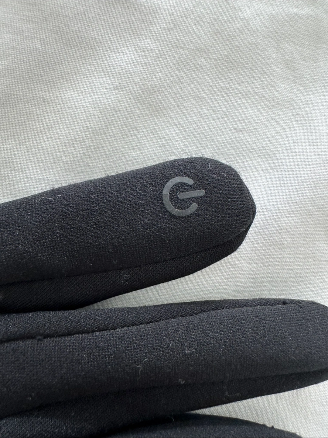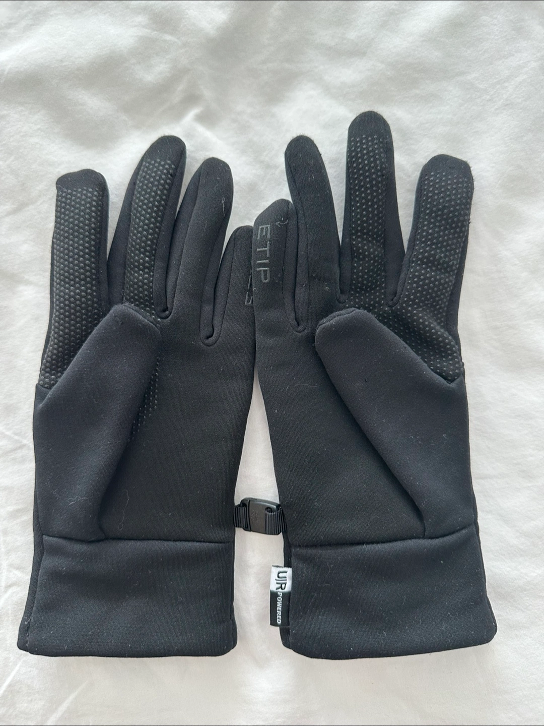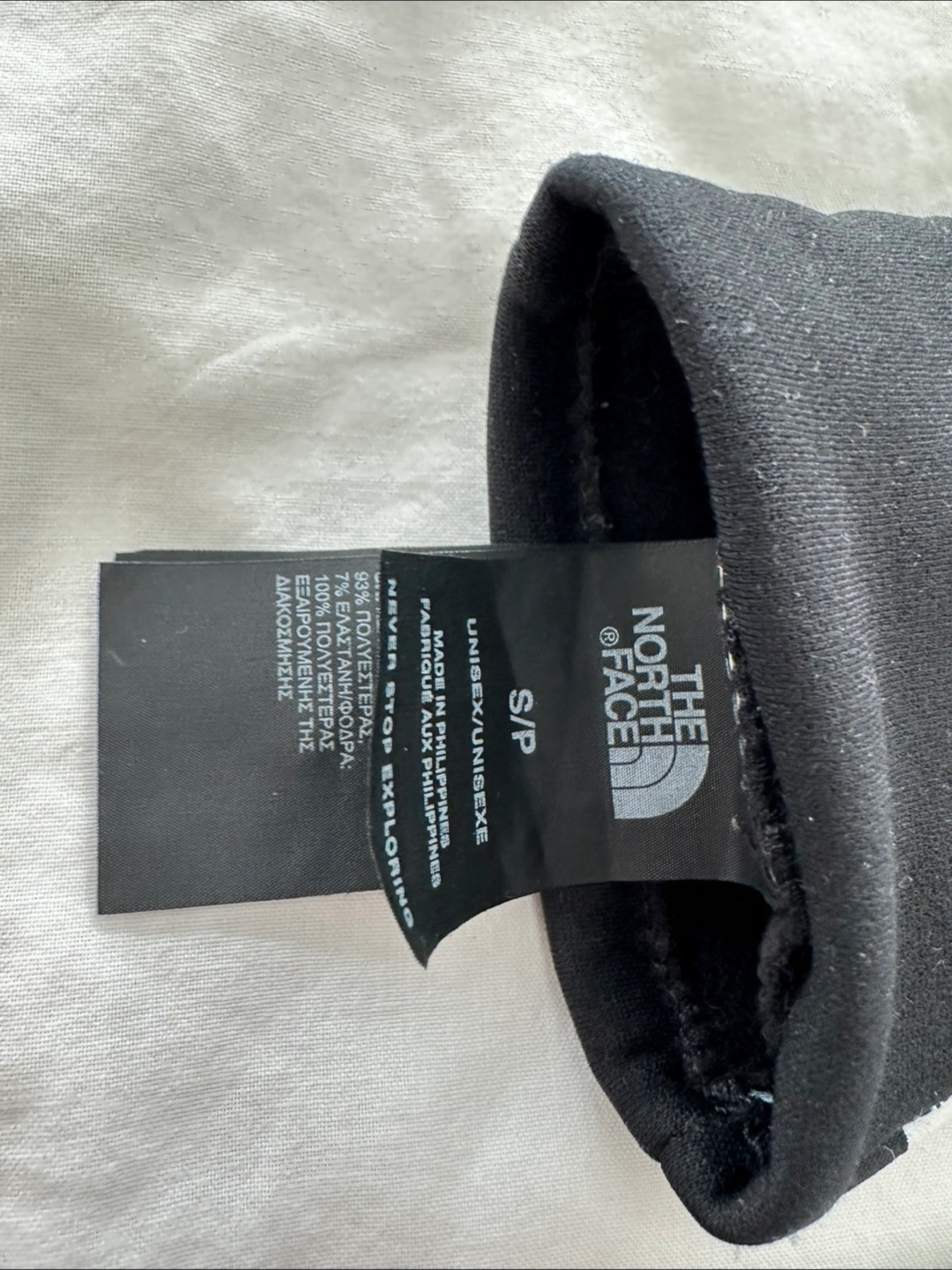 These are The North Face Etip gloves in black. They're size S/P and made with 93% polyester and 7% elastane. The palms have grippy texture for better hold. They feature a power button logo, indicating touch screen compatibility.