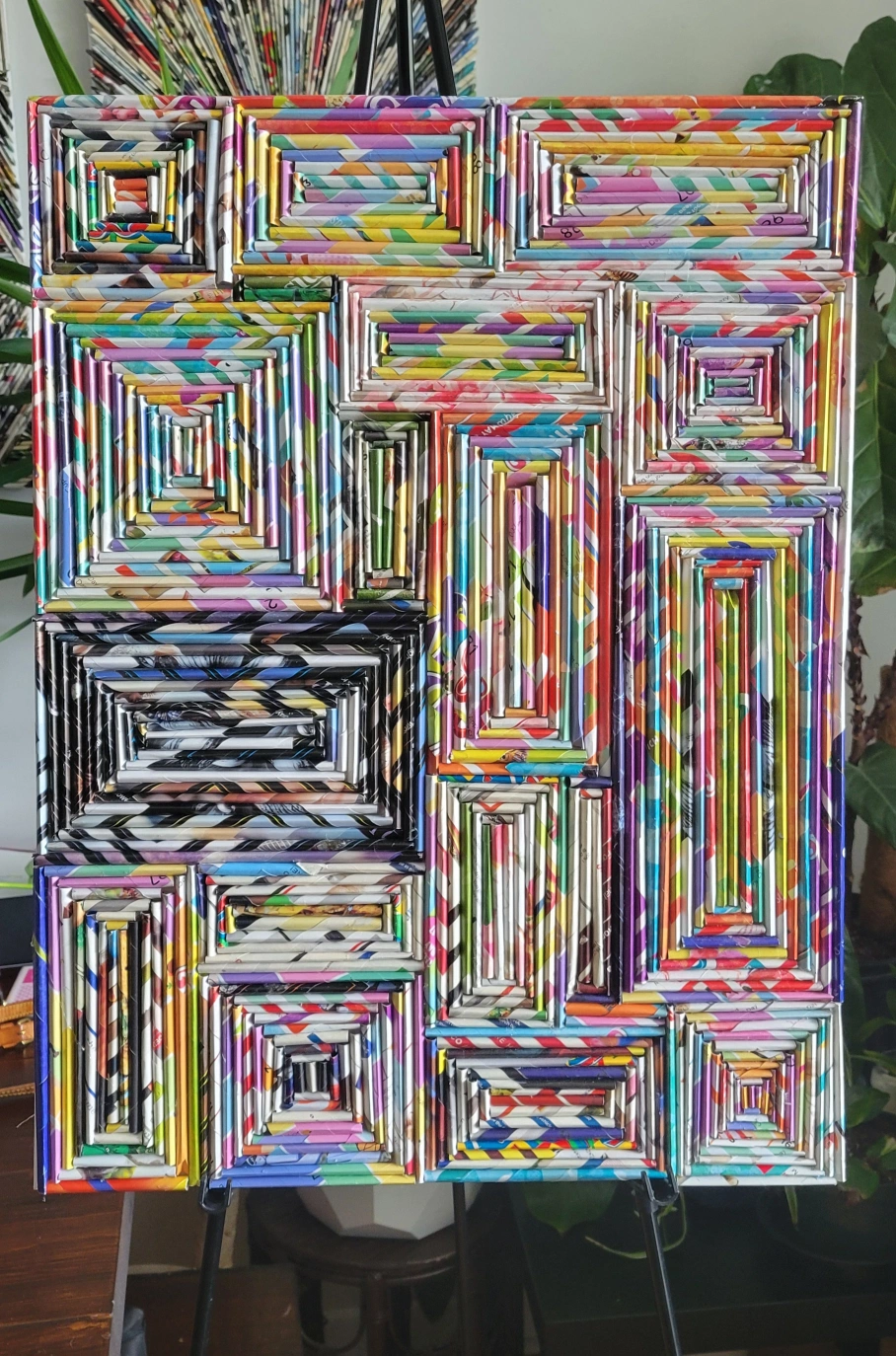 Unique and colourful handmade wall art piece! This is made from rolled paper and arranged in a geometric design. It's a great way to add a pop of colour and texture to your home decor. Perfect for anyone looking for a one-of-a-kind art piece.