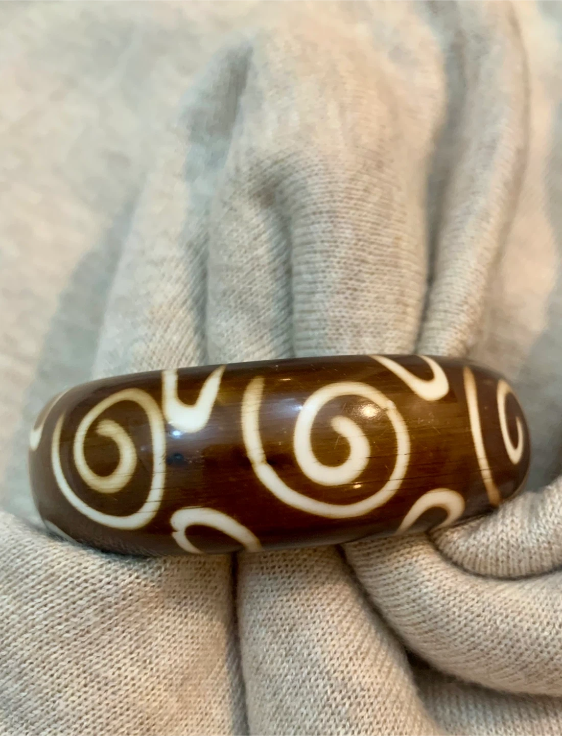 A stylish bangle bracelet featuring a brown wood base with a unique white spiral pattern. It's in great condition and ready to add a touch of flair to your outfits!