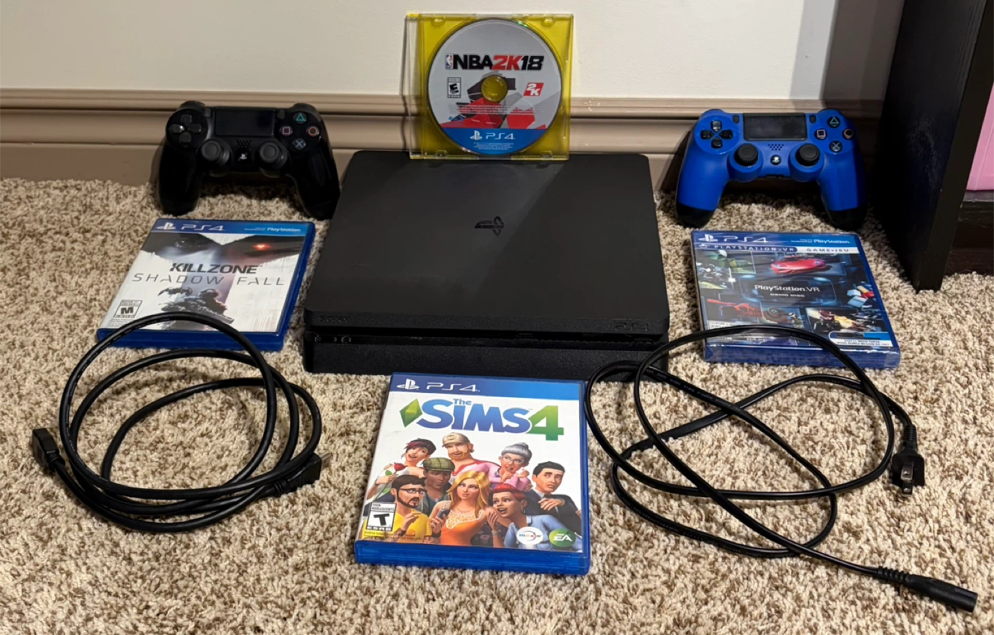 This PlayStation 4 Slim bundle includes the console, two DualShock 4 controllers (one black, one blue), and several games. Included games are NBA 2K18, Killzone: Shadow Fall, The Sims 4, and PlayStation VR Demo Disc. Power cables are also included.