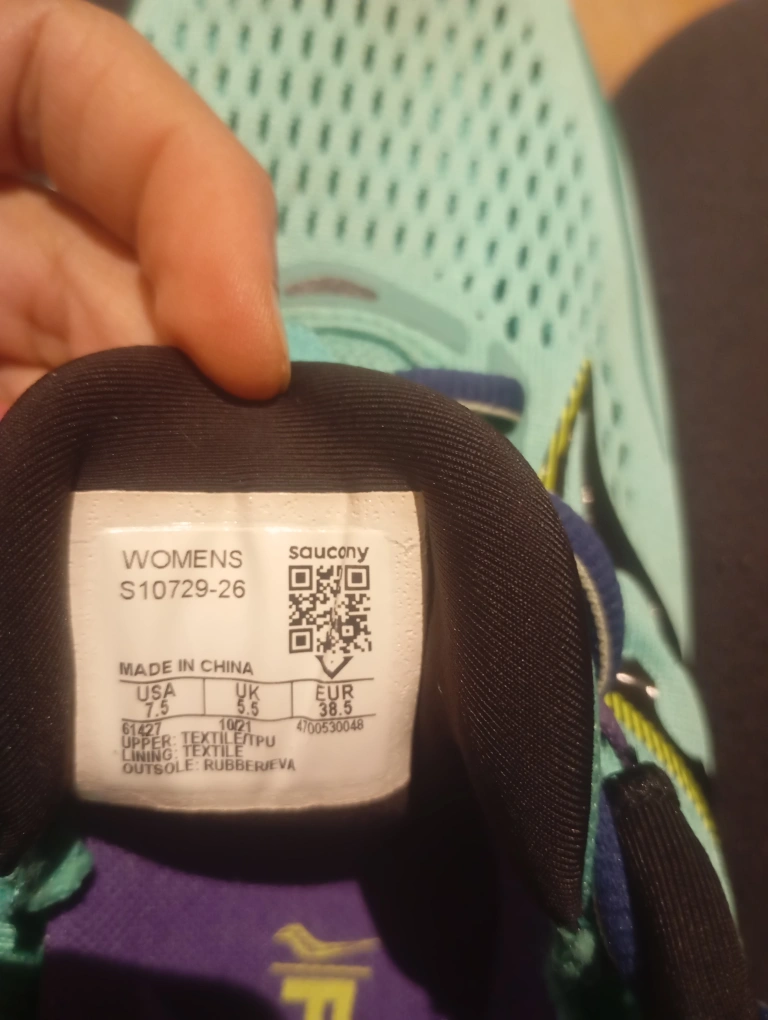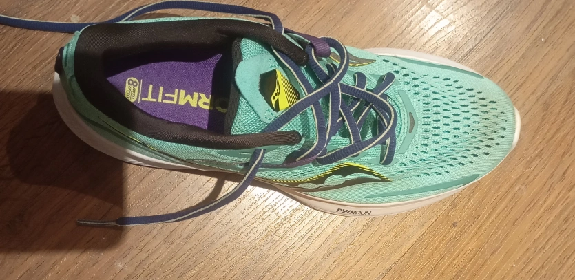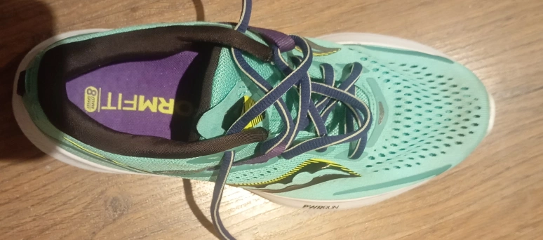 Selling a pair of Saucony women's running shoes in size 7.5. They feature FORMFIT technology and PWRRUN cushioning for a comfortable run. The upper is made of textile/TPU, and the outsole is rubber/EVA.