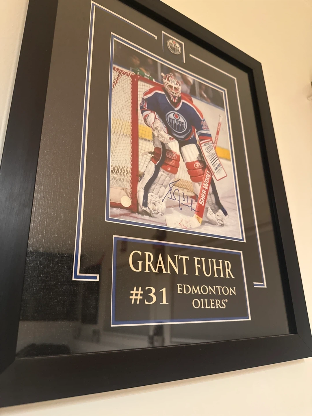 Framed photograph of Grant Fuhr, #31, of the Edmonton Oilers. It's autographed by the player. Includes a "Frameworth Sports Marketing Certificate of Authenticity".