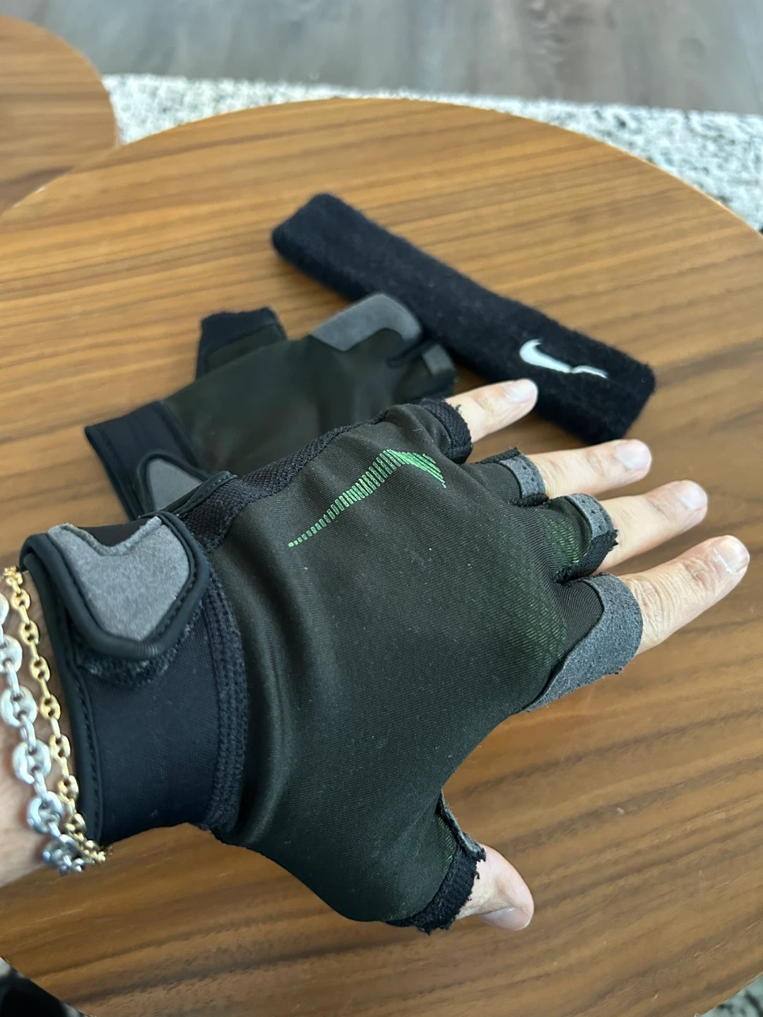 Selling a pair of Nike training gloves and a matching headband. Both items are in good condition and ready for your next workout! The headband was bought at Decathlon. Perfect for gym workouts or any fitness activity!