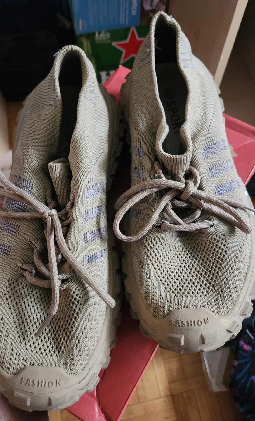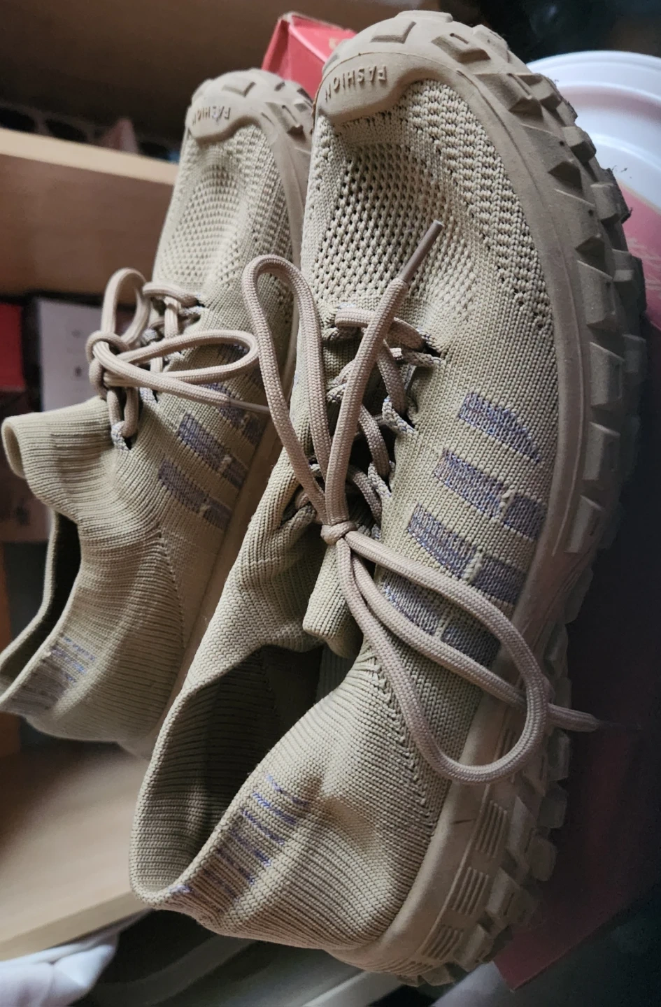 These tan knit sneakers have "Fashion" printed on the front and "Sport" on the inside tag. They're comfortable with a lace-up closure and a durable sole. Great for everyday wear!