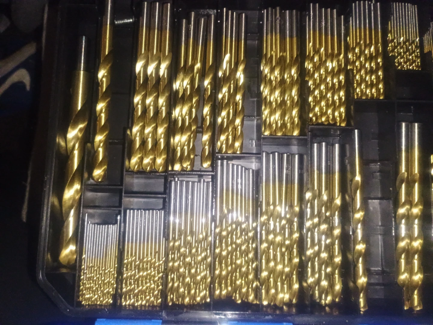 A comprehensive set of Mastercraft drill bits in a durable blue carrying case. Includes various sizes for different drilling needs. Made of high-speed steel with a gold oxide finish.