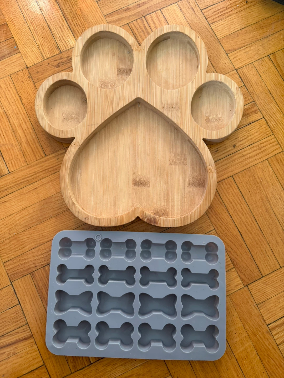 This bamboo tray is shaped like a paw print, with a heart-shaped section in the middle. It comes with a grey silicone mold for making bone-shaped treats. Bamboo construction offers a natural look and feel.