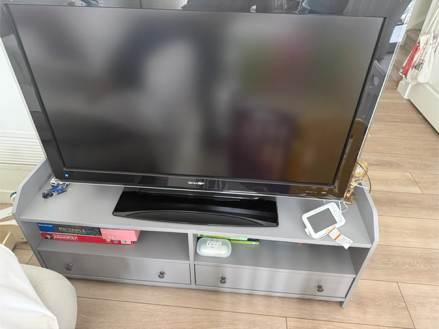 IKEA Grey TV stand with two open shelves and two drawers for storage. It has a smooth finish and is a good size for a bedroom or smaller living space. It holds a television and some media accessories. There is a minor damage.