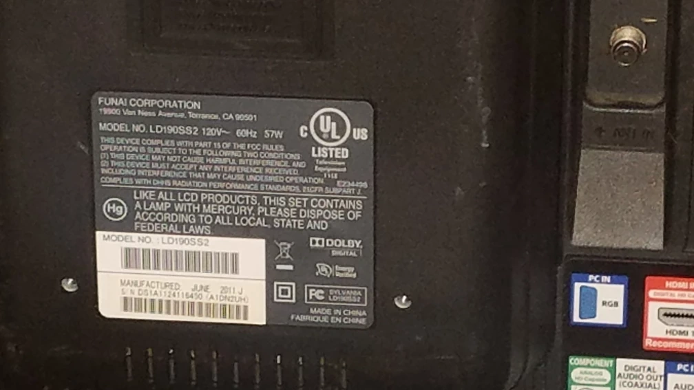 Funai Corporation 1900 Van Ness Avenue, Torrance, CA 90501. Model No. LD190SS2. Manufactured June 2011. This is a 19 inch LCD TV. It's a compact screen.