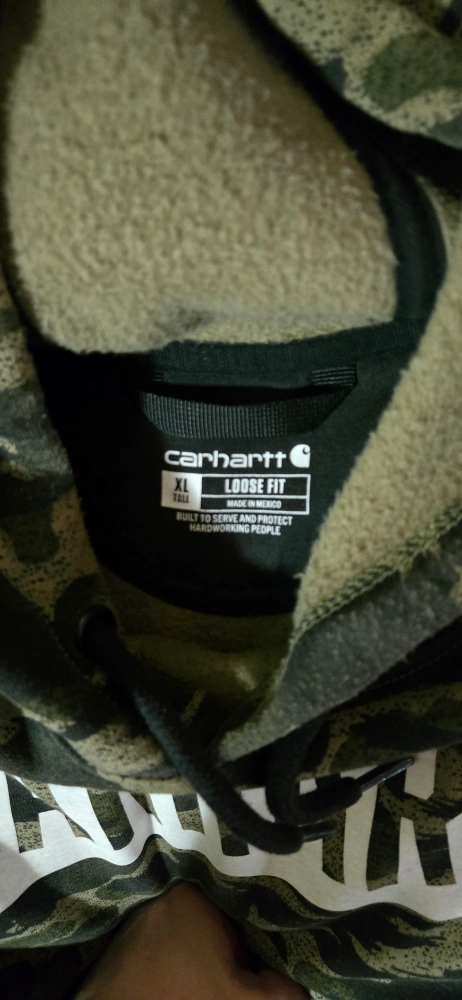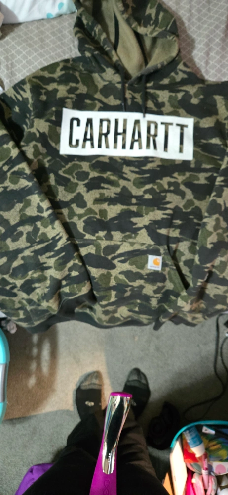 Men's Carhartt hoodie. Loose fit. Camo print. Large white rectangle with Carhartt logo. Size XL. Made in Mexico.