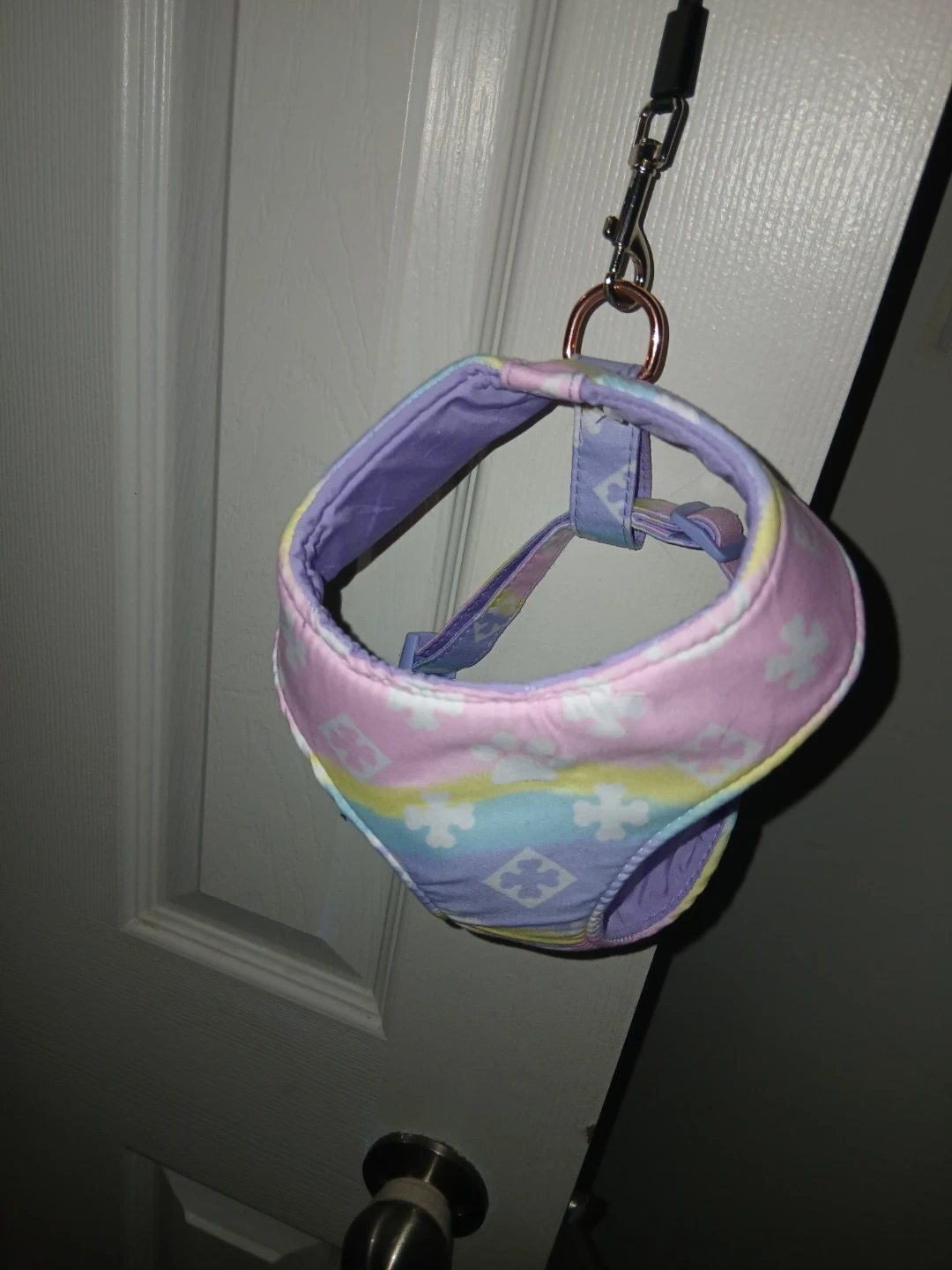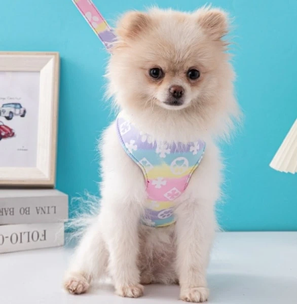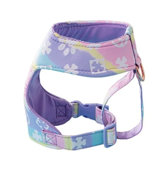This dog harness has a pastel tie-dye pattern with floral accents & includes an adjustable strap. It's designed for comfort and style for your furry friend! + Leash (Last Photo)