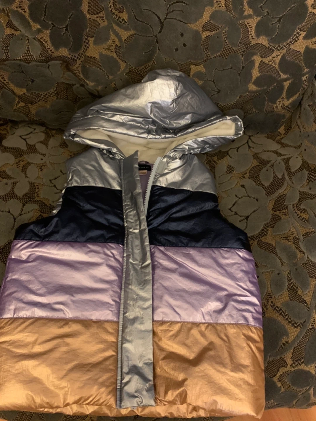 This Andy & Evan puffer vest is a size 5 and features a multicoloured metallic design with a soft lining. It's perfect for layering during cooler weather. Zipper closure for easy on and off.