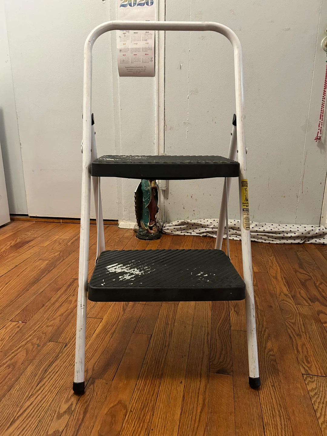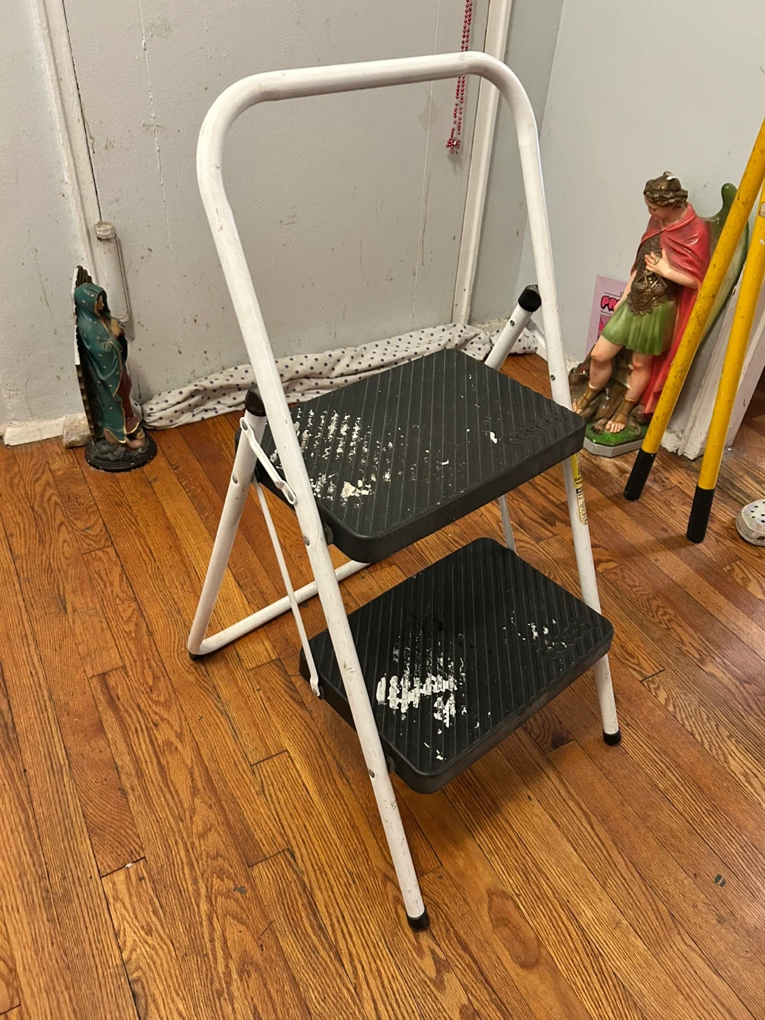 This is a white 2-step folding step stool ladder. It's made of metal with black non-slip treads on the steps. The ladder folds flat for easy storage. It's great for reaching high shelves!
