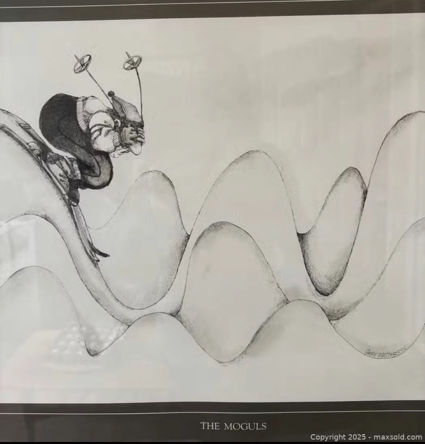 This framed art print features a whimsical drawing titled "The Moguls," signed by Patterson. It captures a skier navigating a bumpy slope with exaggerated style. Perfect for a ski enthusiast's home decor!