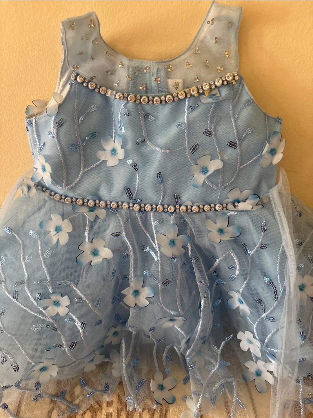 A beautiful light blue dress with floral embroidery and bead accents. It features a sheer neckline with delicate beading. The skirt is layered with a floral pattern and sparkly accents. This dress is perfect for special occasions!