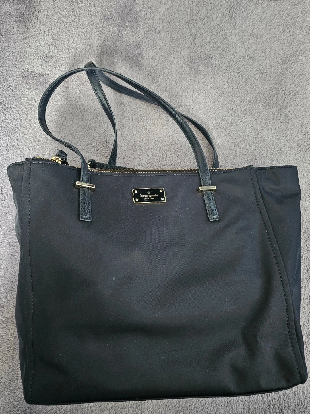 A black nylon tote bag from Kate Spade. It has leather straps and gold hardware. It's a practical size for everyday use. This tote is suitable for carrying essentials.