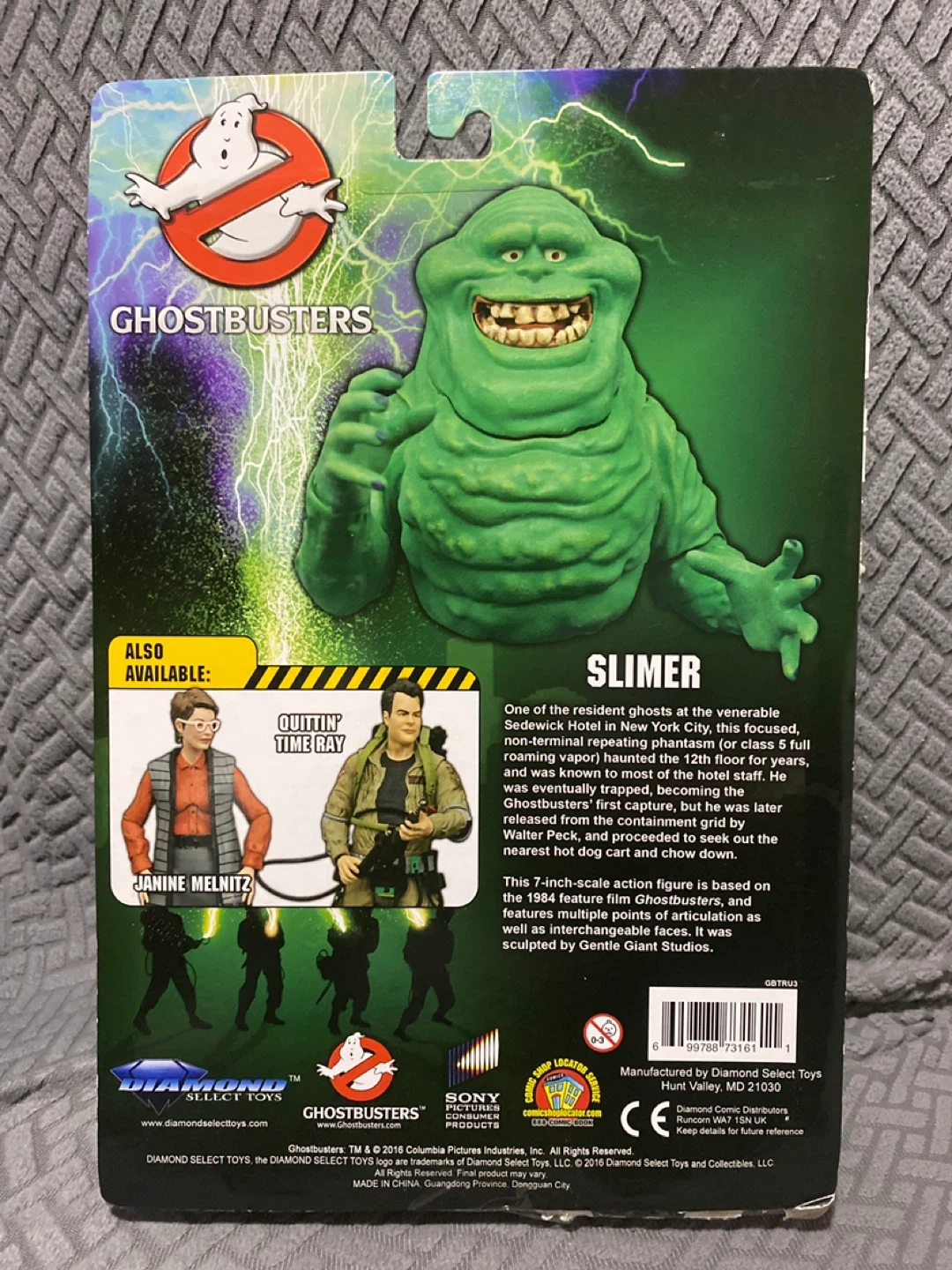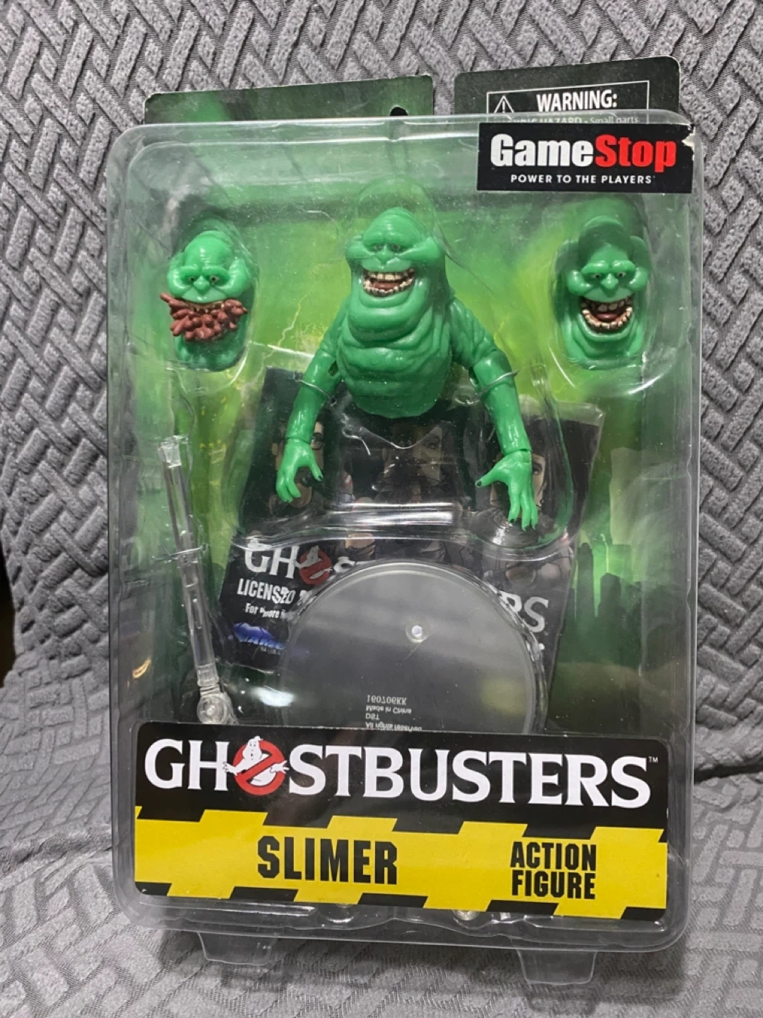Selling a 2016 Ghostbusters Slimer Action Figure by Diamond Select Toys. This is a 7” scale Slimer ghost figure with 3 interchangeable faces. This box set has been opened and displayed once. The figure and 3 faces are in “like new” condition. The stand is broken. The peg from the stand got stuck in the hole of the platform. Might be able to replace or repair. Sold as is. See pictures.