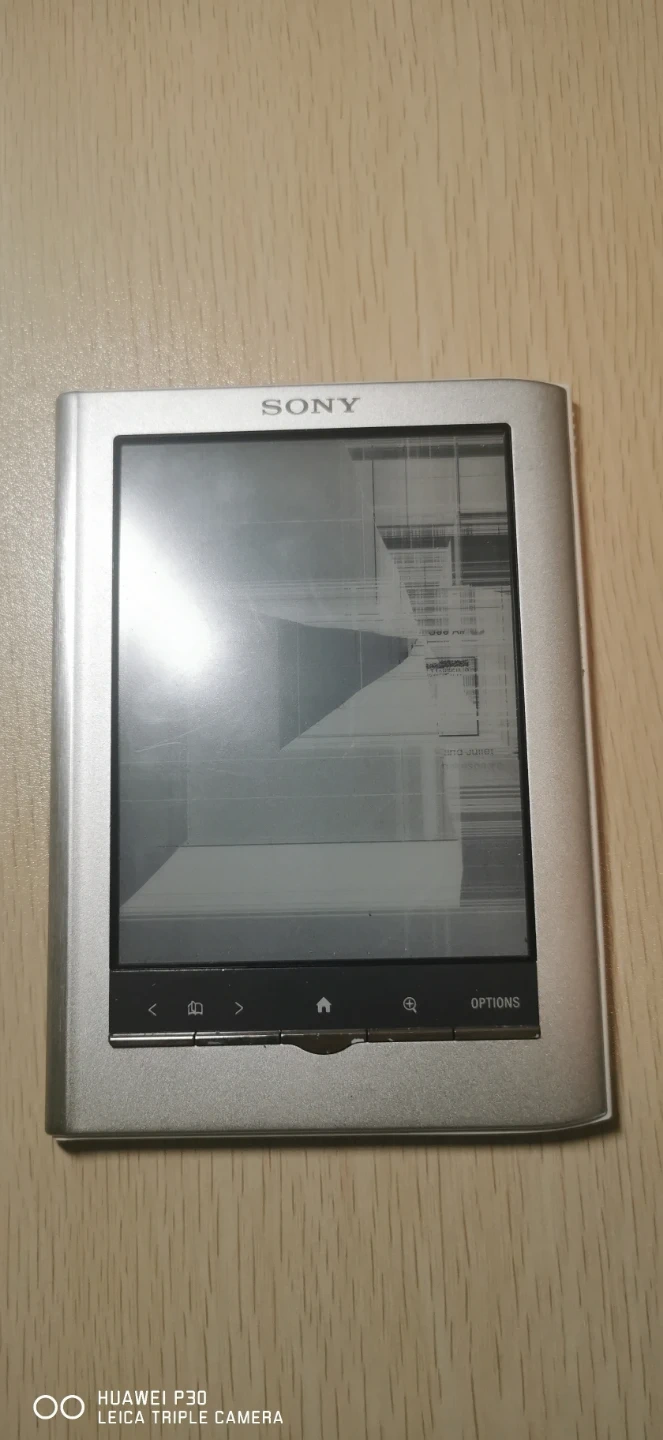 Sony Reader digital book. It's a silver e-reader. The screen is broken and is showing the last gasp of this ereader, is possible to fix, but sold as a display or part.