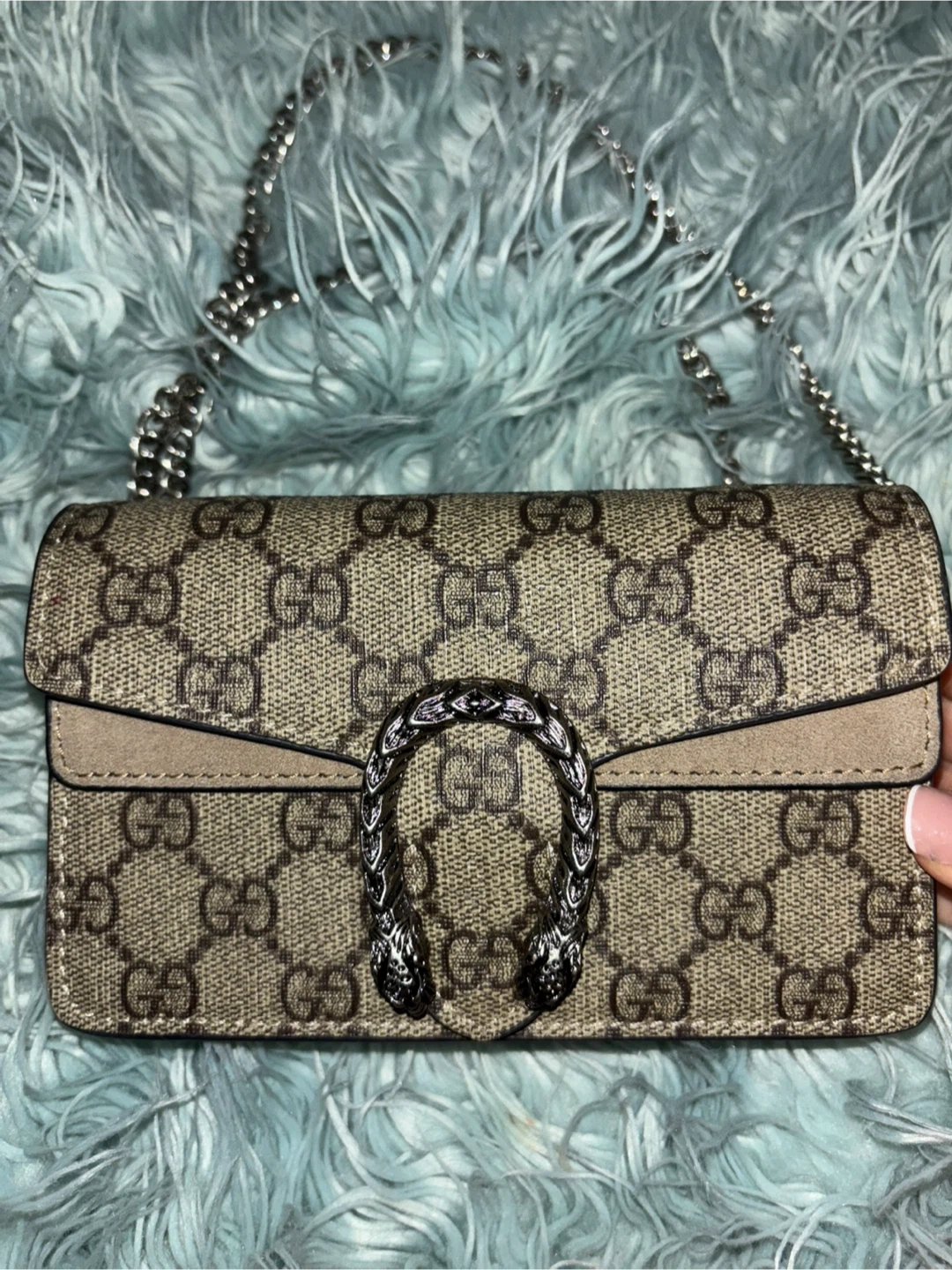 Selling a Gucci Dionysus chain wallet. It has the iconic Gucci monogram pattern and the Dionysus tiger head closure. It comes with the original box and care booklet. There appears to be a small mark on the suede.