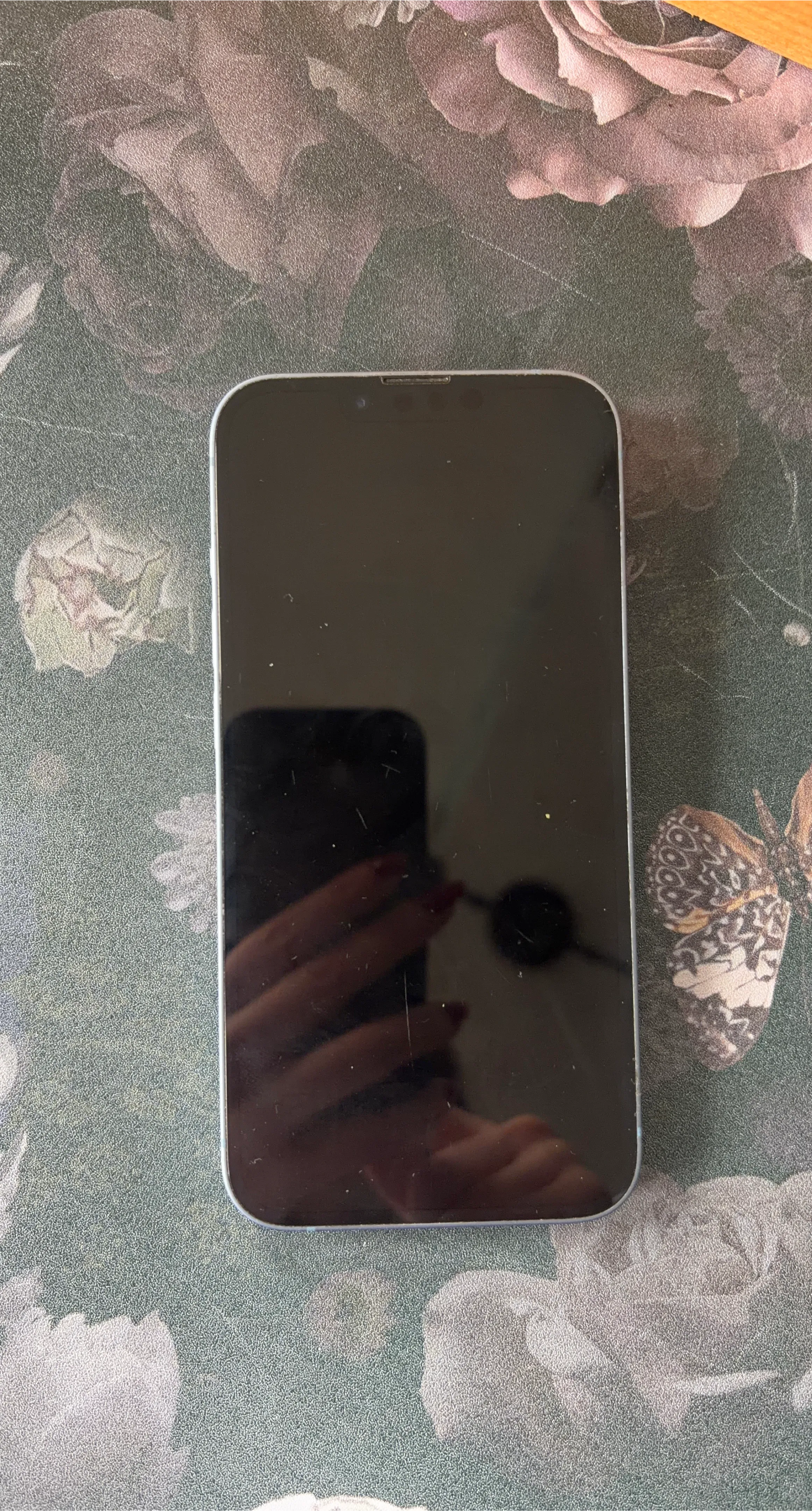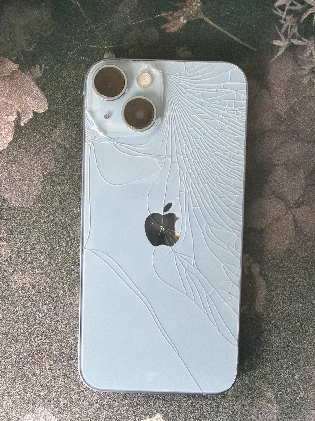 This is an Apple iPhone 14 in blue. The back glass is cracked. It's a good candidate for repair or parts. Phone is functional.