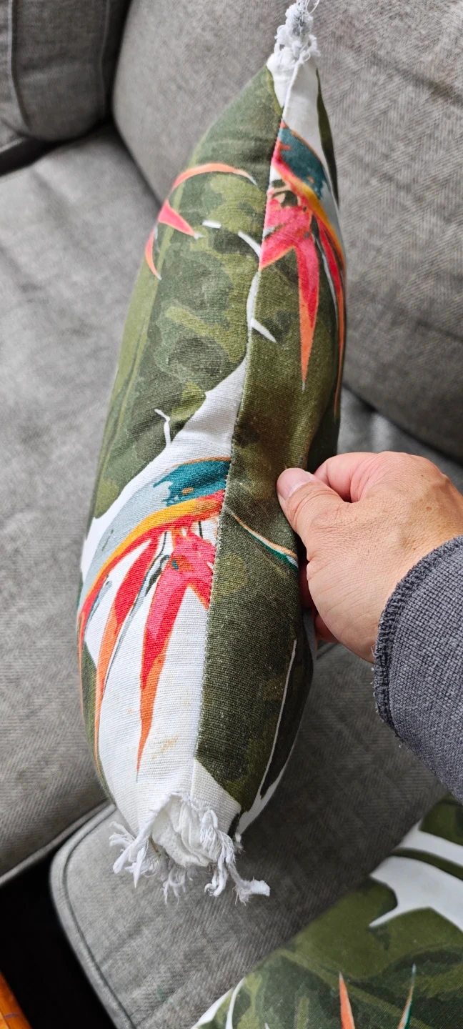 I'm selling a set of two throw pillows featuring a tropical print. They measure approximately 17 inches. These pillows would add a nice pop of colour to any room!