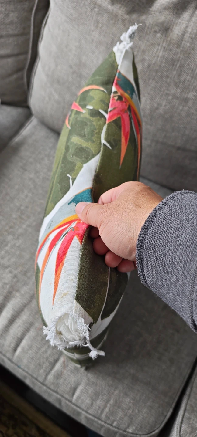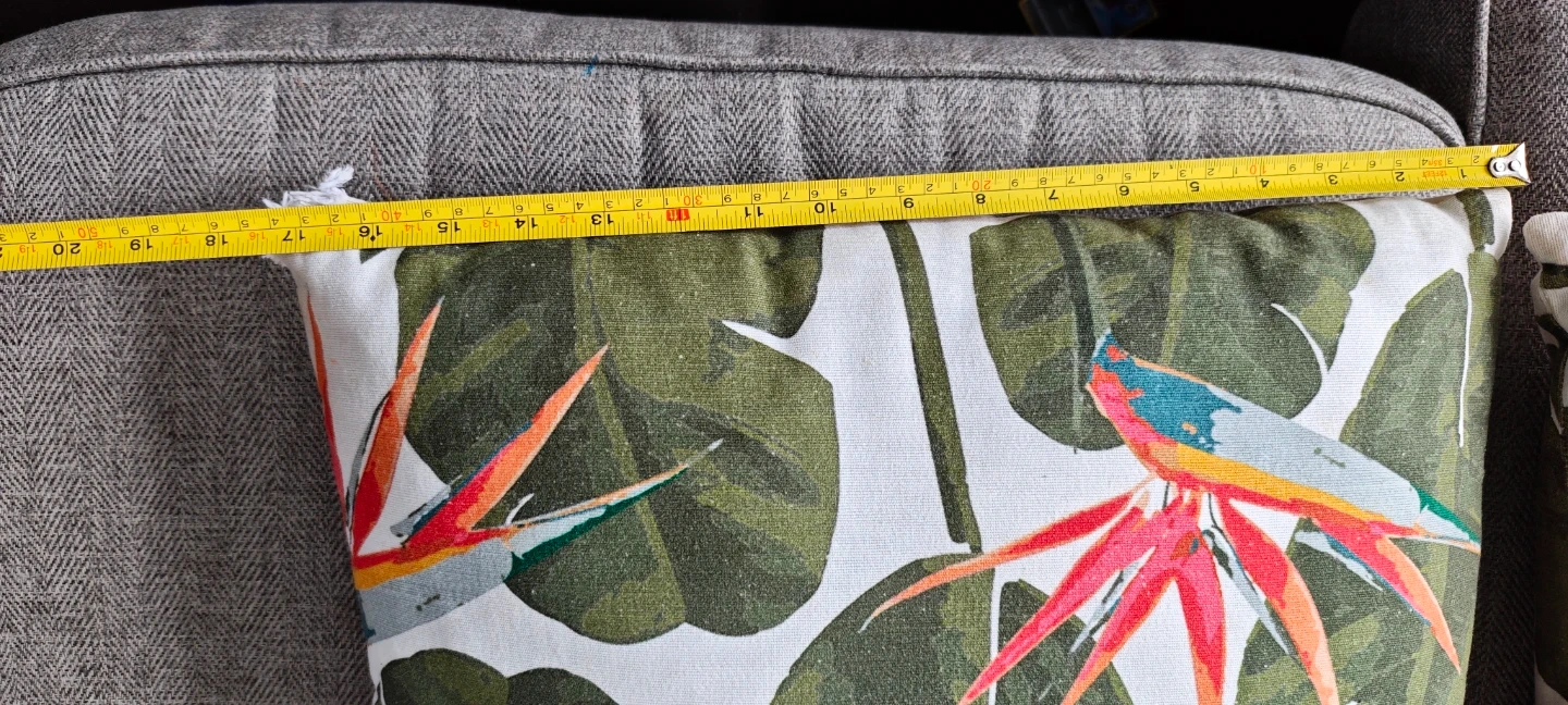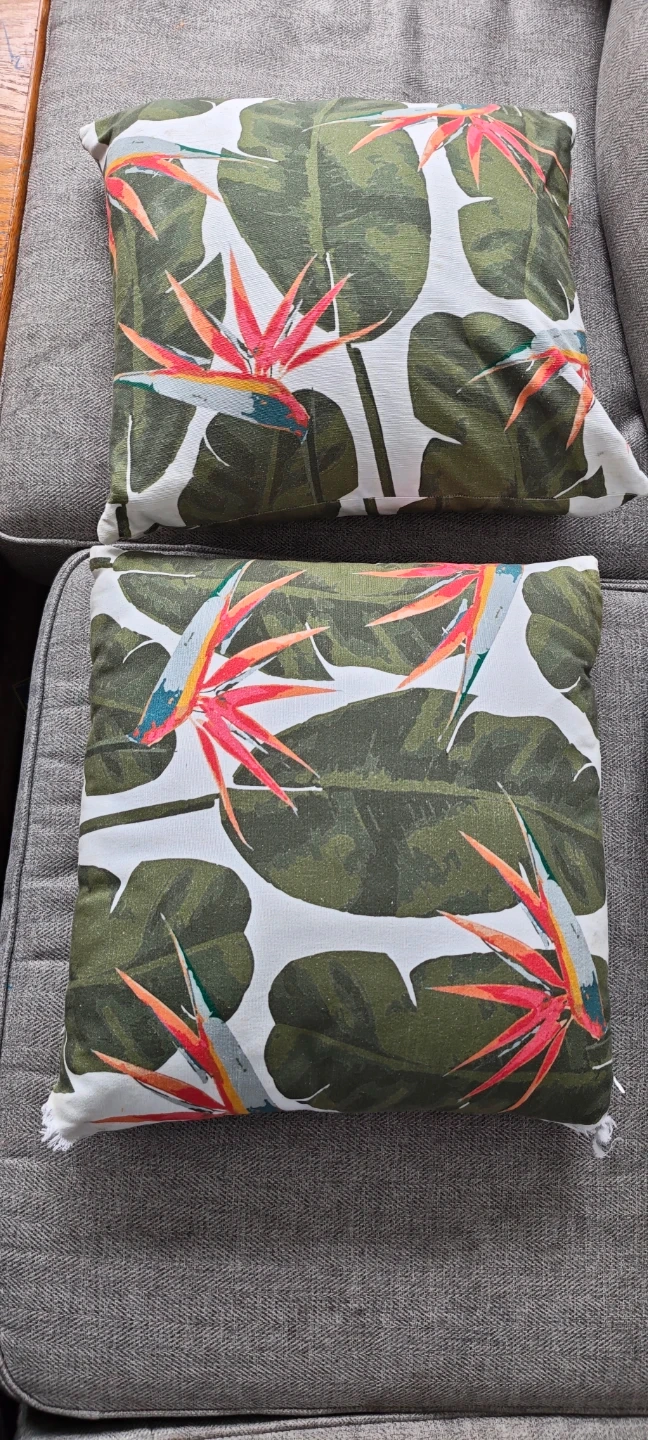 I'm selling a set of two throw pillows featuring a tropical print. They measure approximately 17 inches. These pillows would add a nice pop of colour to any room!
